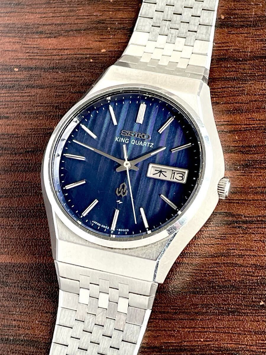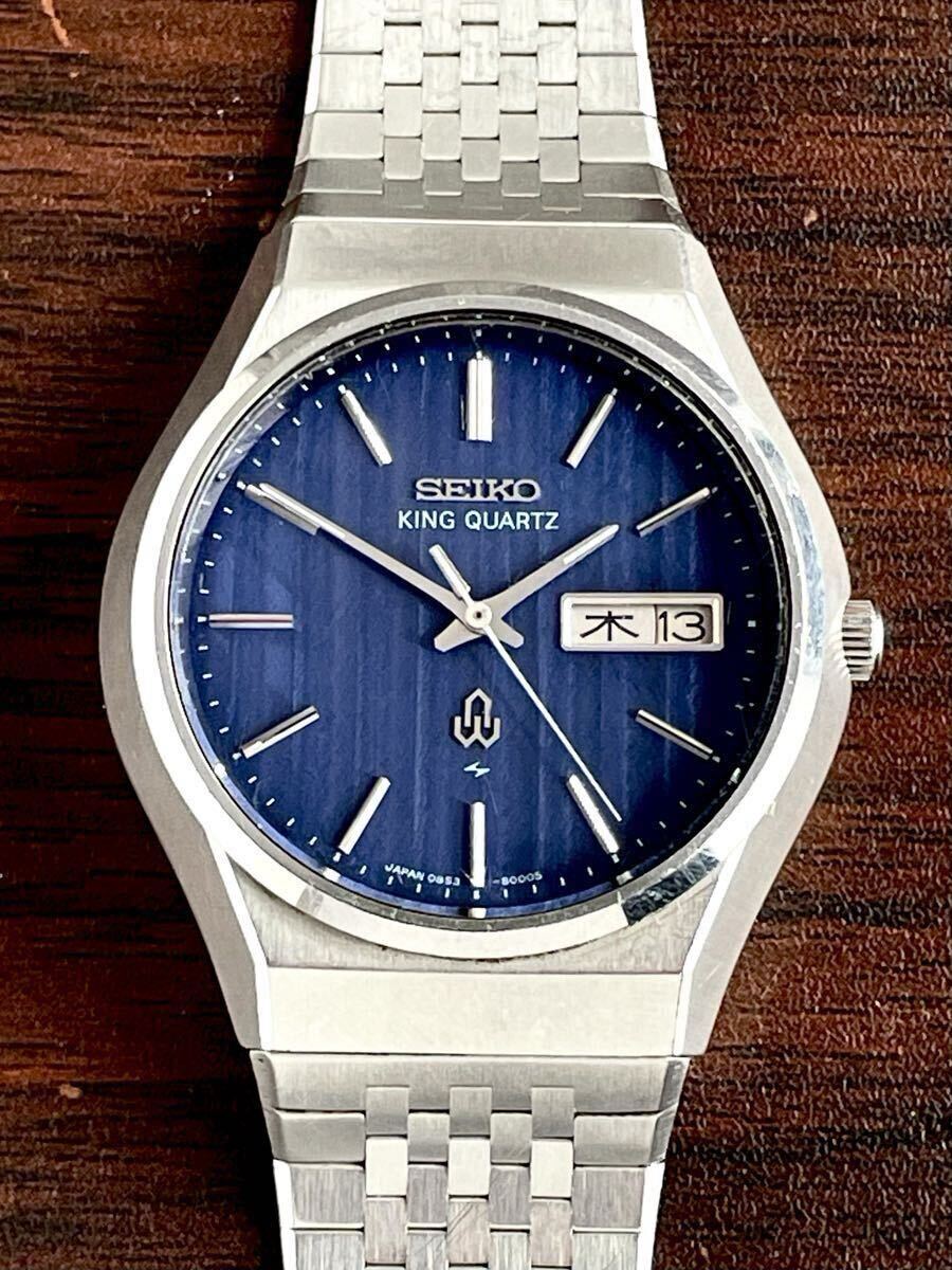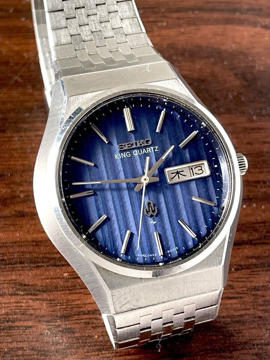 綺麗なネイビーの文字盤のキングクォーツ!順調に作動中です!SEIKO純正キングクォーツオリジナルSSベルトは伸びやダレが少なめの良品!SEIKO KING QUARTZ セイコー キングクォーツ 0853-8001 (文字盤下部の表記の下4桁は8000 になります)メンズ腕時計の出品です。