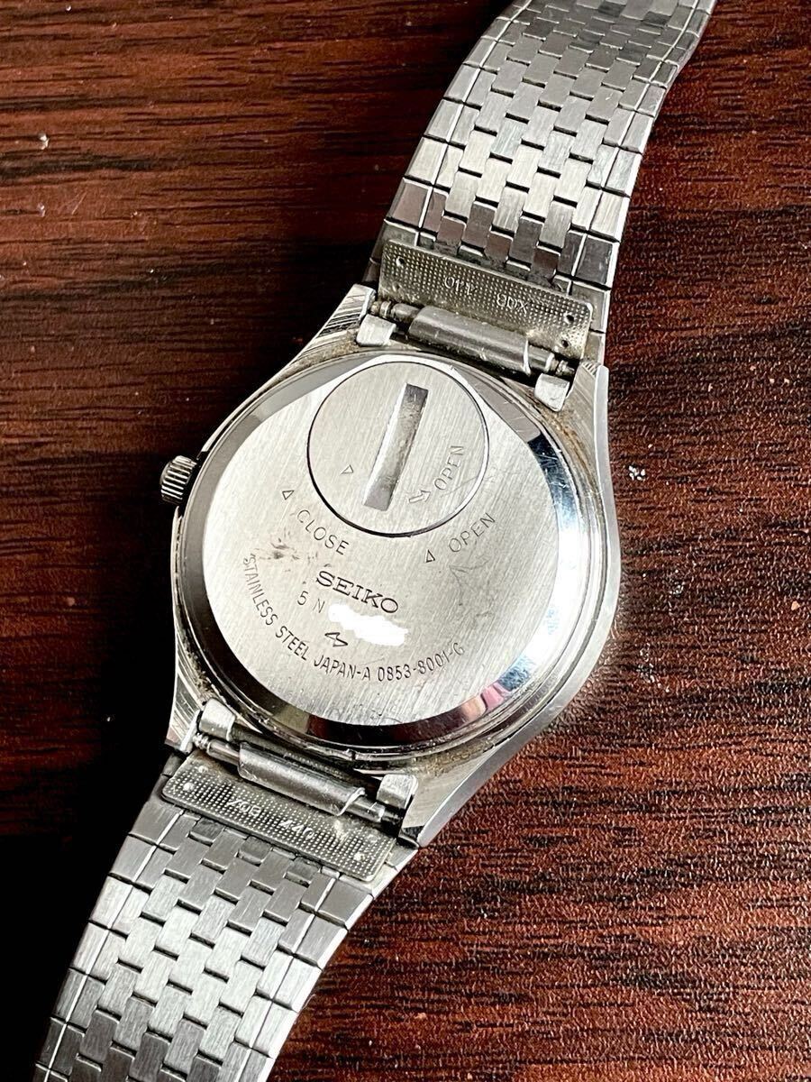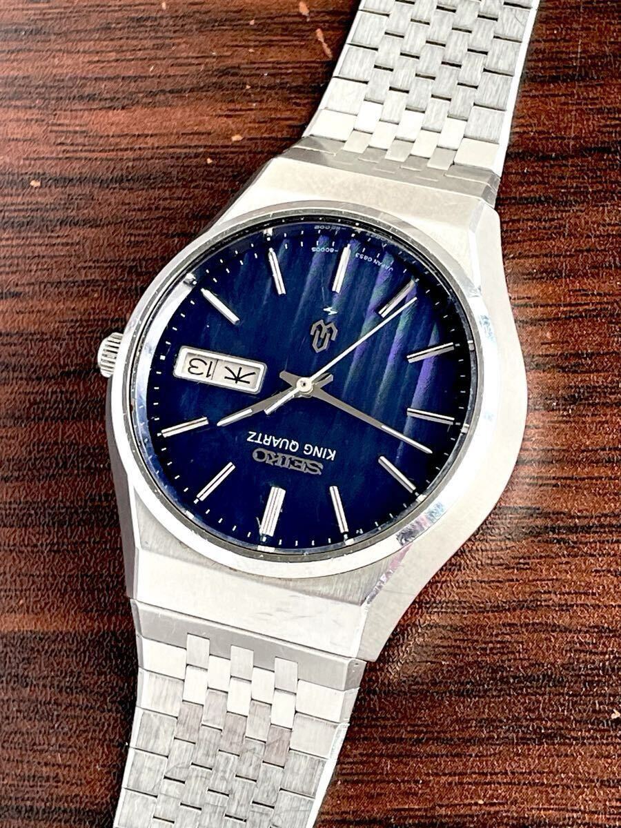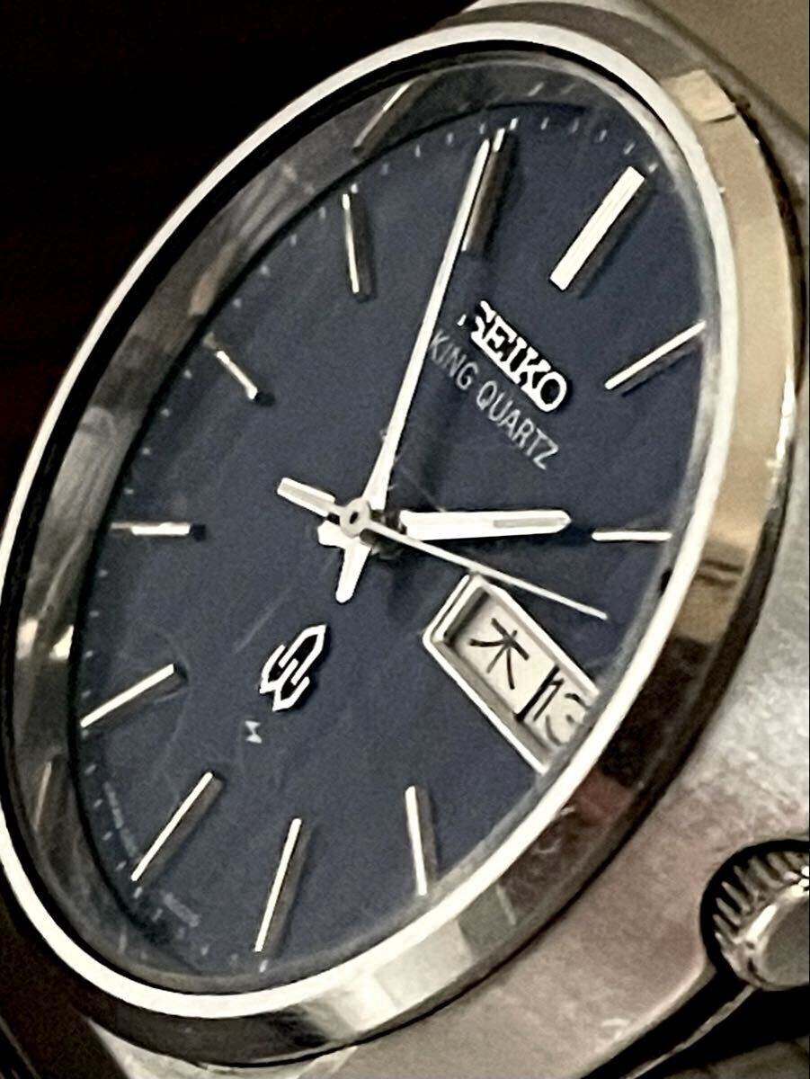 綺麗なネイビーの文字盤のキングクォーツ!順調に作動中です!SEIKO純正キングクォーツオリジナルSSベルトは伸びやダレが少なめの良品!SEIKO KING QUARTZ セイコー キングクォーツ 0853-8001 (文字盤下部の表記の下4桁は8000 になります)メンズ腕時計の出品です。