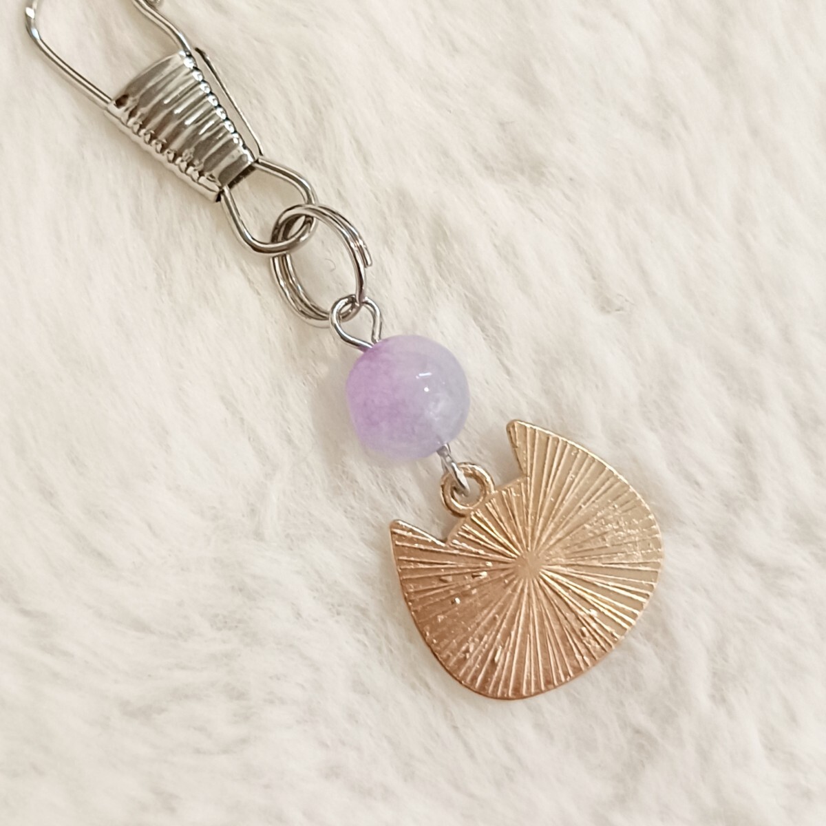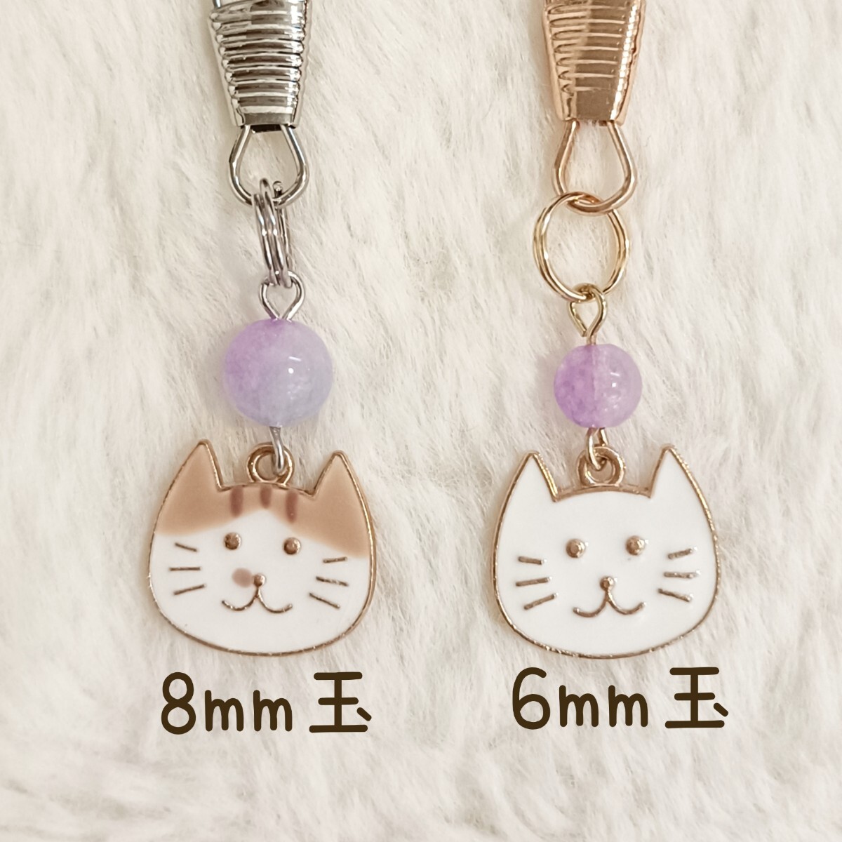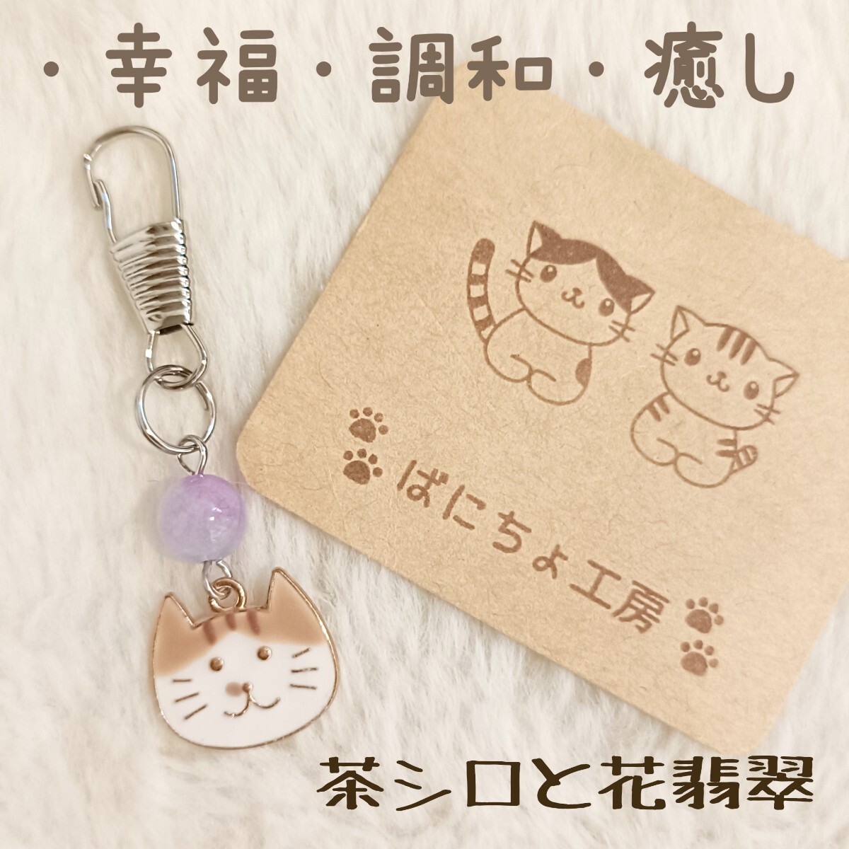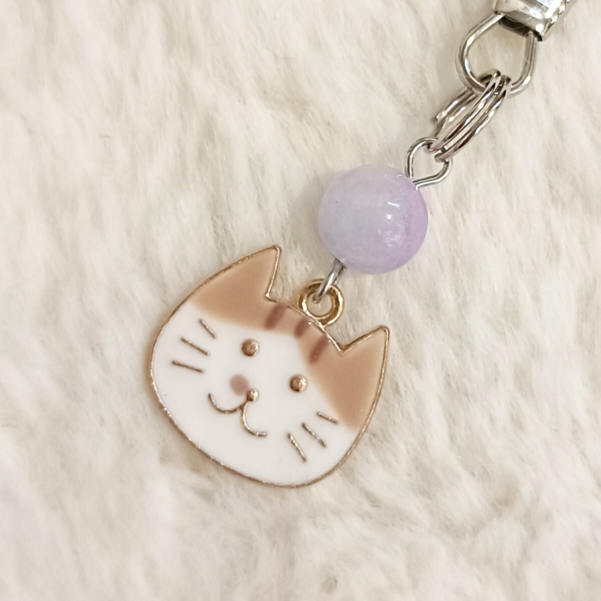 わが家のニャンコたちをイメージして描いたチャームにパワーストーンを添えたキーホルダーです(=^・^=)