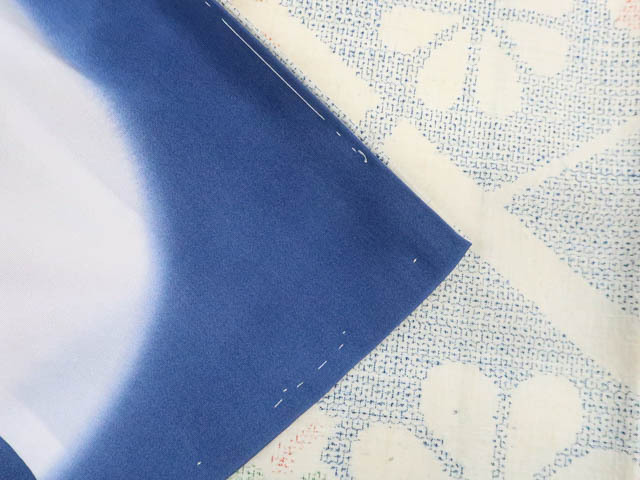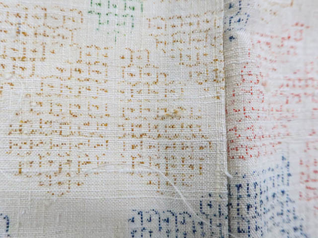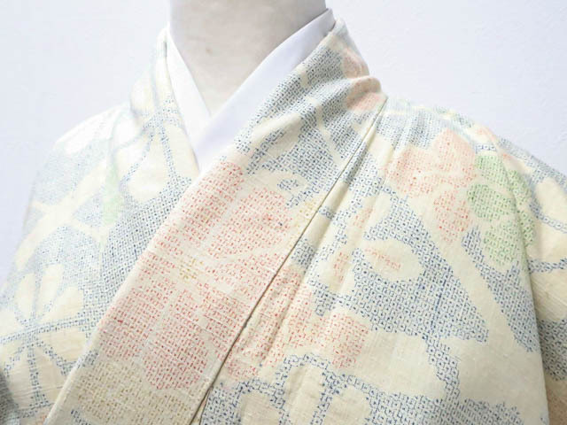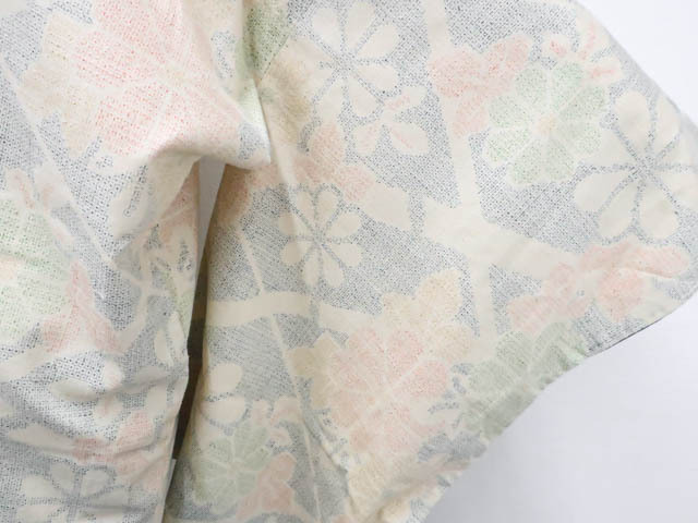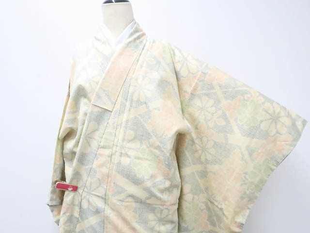 リサイクル商品のため、所々薄しみがございますが着用可能なお品です。 地色は生成です。 1枚目の画像が近いお色かと思われます。 素材は正絹です。 |