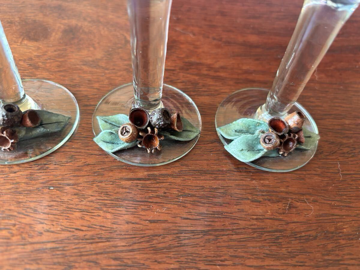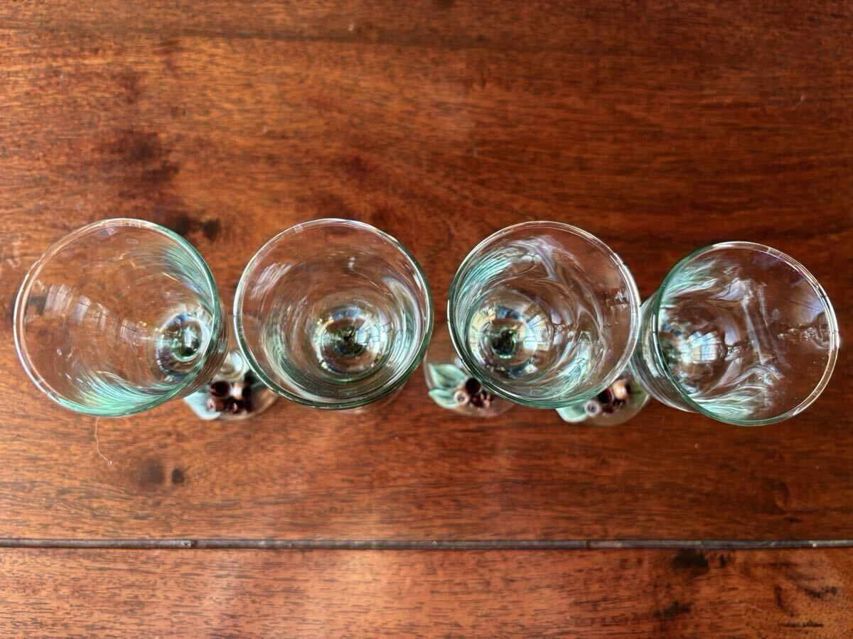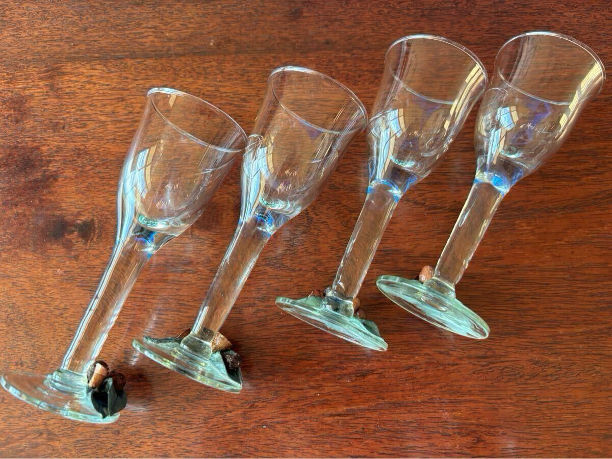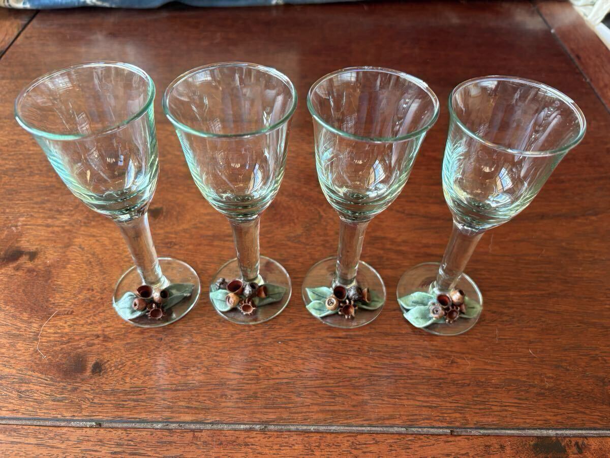 ワイングラス(リキュールグラス)4脚セット、台座に木の実や葉を模した装飾が施されています。