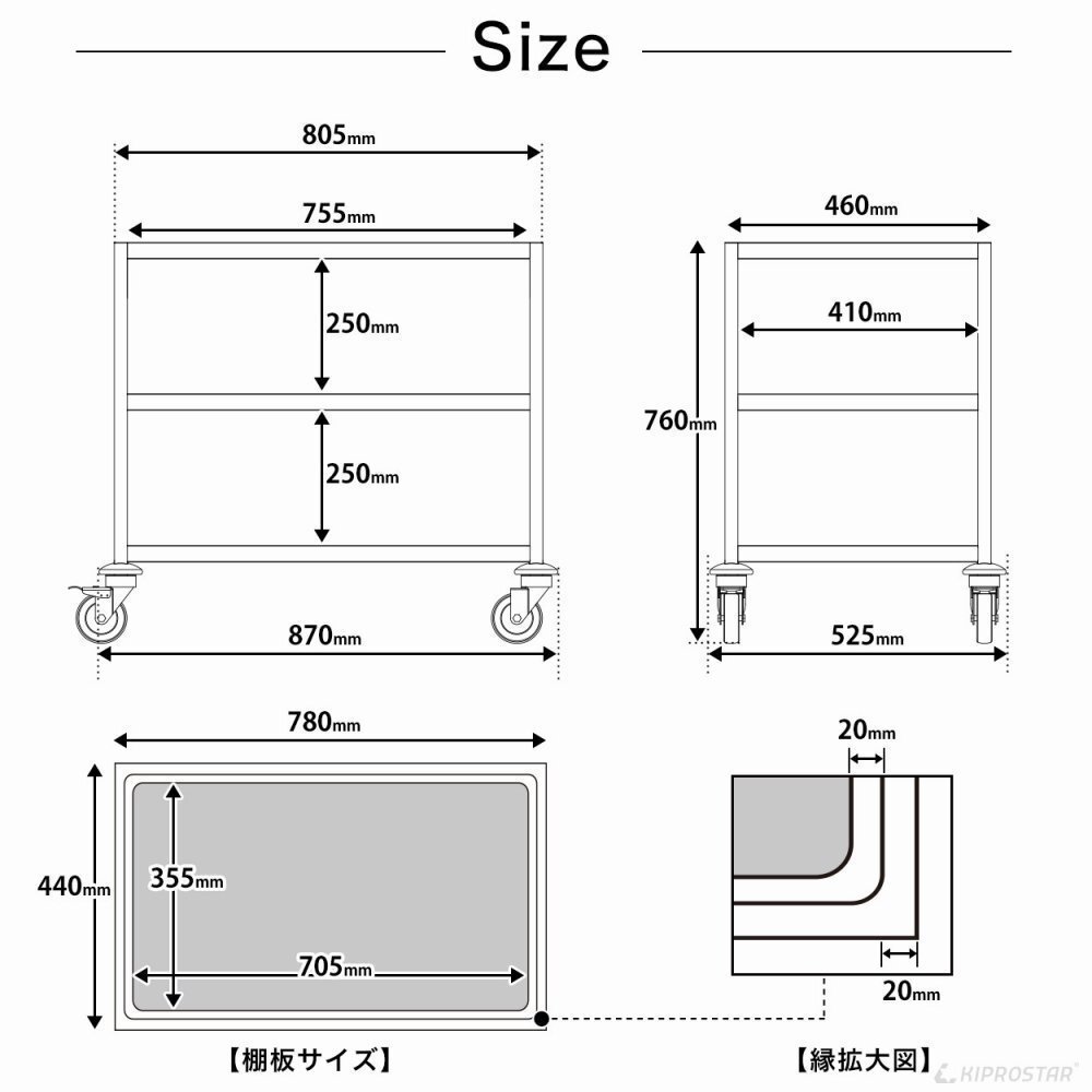 | 仕様 | 3段 フラットタイプ キャスター4輪自在、2輪ストッパー付 |