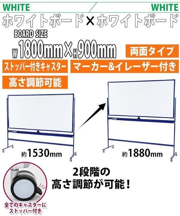 | 商品名 | 送料無料 ホワイトボード 脚付き 高さ2段階 高さ調節 1800×900mm 両面 ハイグレードモデル フレームカラー ブルー ストッパー付キャスター 回転式 W1800×H900mm 180×90cm トレイ マーカー イレーザー付き スタンド 足付き アルミ枠 スチール 高さ調整 段階 whbdaf18090wwst |