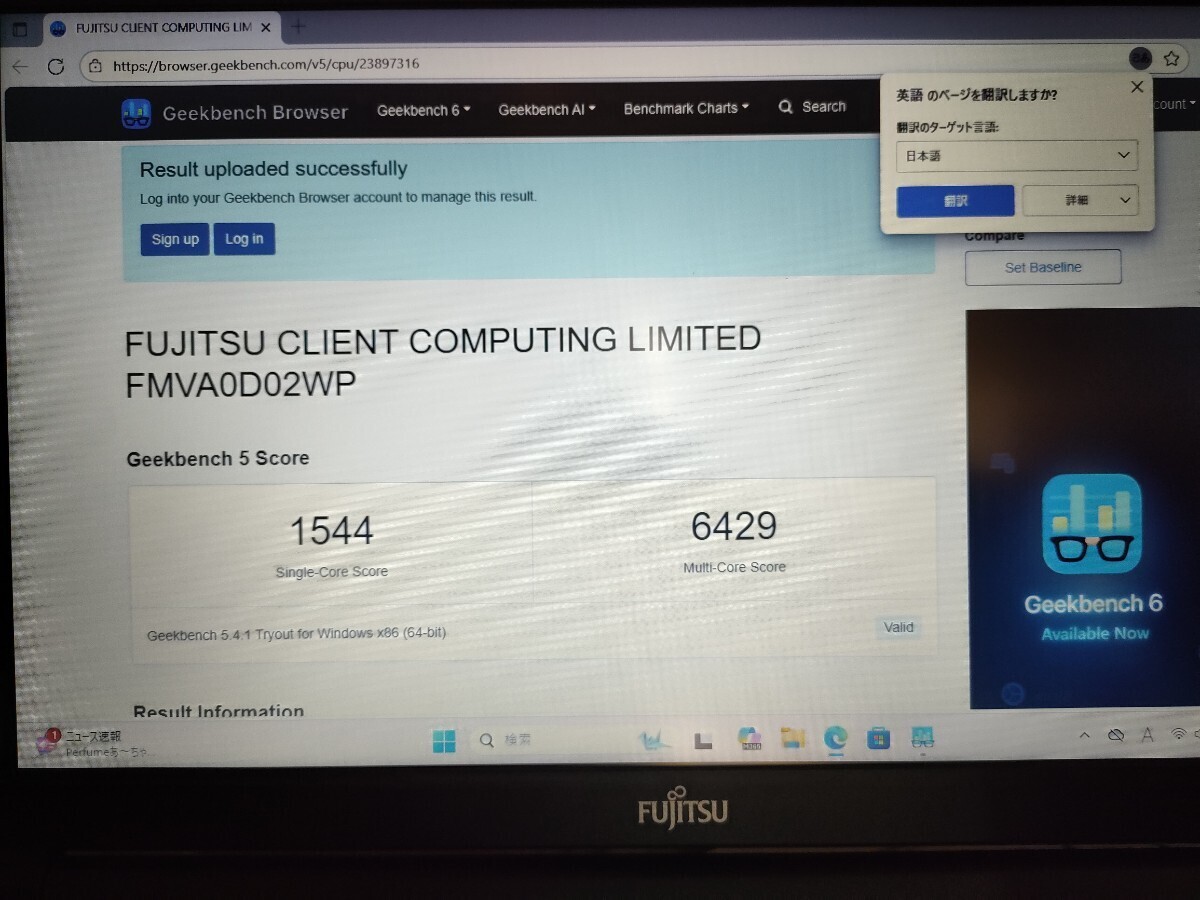 プロセッサベンチマーク シングルタスクスコア:1544 マルチタスクスコア:6429