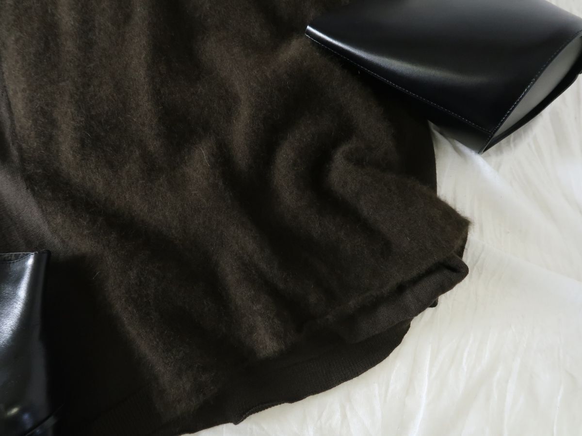 前身頃は上質なラクーンカシミア素材。肌当たりがとても柔らかく、軽く暖かく、そして繊細な起毛が特徴です。後ろ身頃と袖はファインメリノウールを使用した収縮性の高いリブ編みです。
