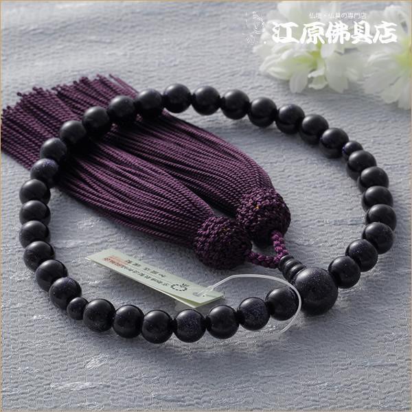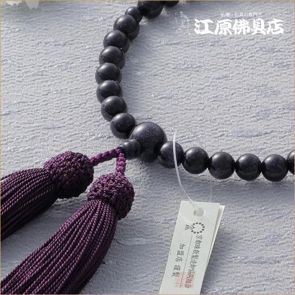 めずらしい紫金石の数珠です。不透明な藍色の地色に銅の金属細片を含んだガラスで出来ており、光が当たるとキラキラと輝きます。とてもきれいな色合いで女性に人気の紫系色の数珠です。