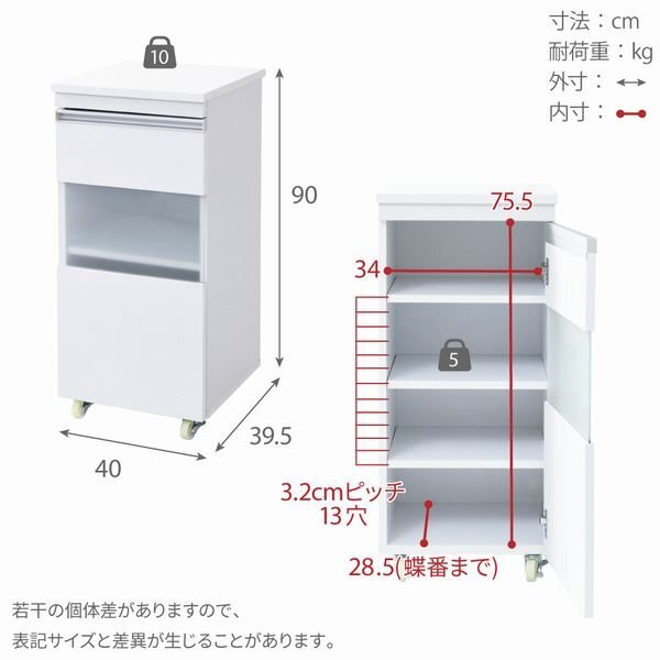 【カラー】 ホワイト、ホワイト×ダークブラウン 【サイズ】 <外寸> 幅40×奥行39.5×高さ90cm <内寸> 扉内:幅34×奥行28.5×高さ75.5cm 可動棚:幅35.5×奥行33×厚み1.8cm(3.2cmピッチ13穴) 【材質】 天板・前板:合成樹脂化粧合板(PVC) 本体:プリント紙化粧合板 ガラス:強化ガラス(5mm厚) 【耐荷重】 天板:(約)10kg以下 可動棚:各(約)5kg以下 【生産国】 中国 【梱包】 サイズ:91×43.5×14cm、重量:16.1kg 【その他】 ・背面化粧有り ・可動棚:3枚 ・キャスター4個(うち2個ストッパー付き) 【組み立て品】 お客様による組み立てが必要です。 【ご注意】 ・サイズ、重量は概算です。 ・商品カラーはご使用のモニターによって実際の明るさや色と異なって見える場合がございます。 |