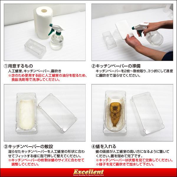 画像7枚目、付属している取扱説明書です。蛹のザイズに合わせてキッチンペーパーの枚数で調整できます。