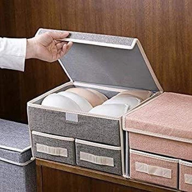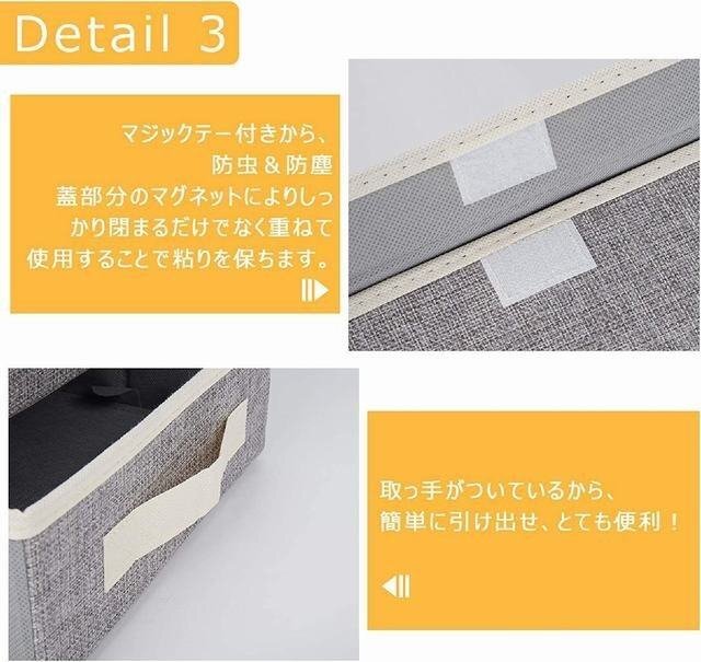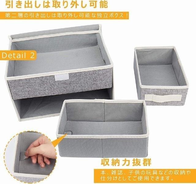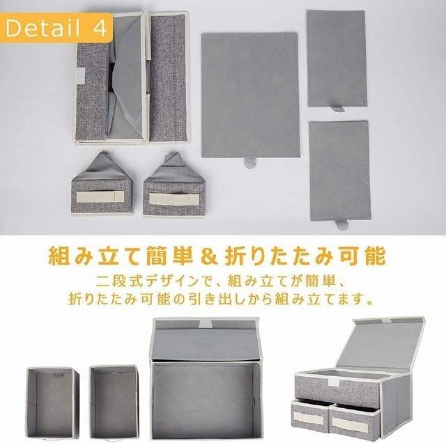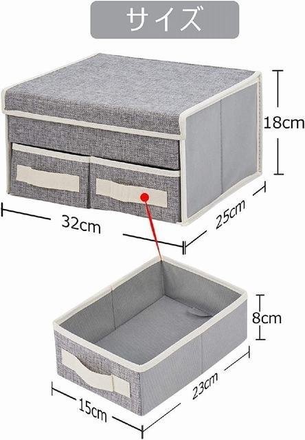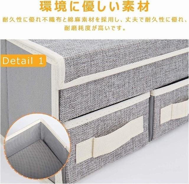 【製品サイズ】掲載サイズ表をご参照ください。 【長持ちできる材質】 ボックスの外は綿麻布材質、汚れにくく、耐摩耗度が高く、耐久性がいい。裏は不織布、通気性が良く、ソフトで収納している物に傷つきません、長持ちで環境に優しいです。 【引き出し収納】 二段式デザインの収納ケースで,ふたが付いてます。上のマジックテープによりしっかり閉まり、虫や埃などが中に入りにくい。 下部の段ボールには、簡単に取り外せるように小さなハンドルが付いています。防黴、防湿という効能があり、耐久性にも優れています。ボックスの中には厚紙の芯材で変形しにくいです。 【組み立て簡単&省スペース】 収納ケースは、折り畳む可能な三つ部分で構成されています、底板を置けば簡単に組み立てできる、使わないときには折畳んて押入れや家具の隙間などに収納して空間節約。 【広がる用途】 下着だけでなく、ストッキングや靴下、ハンカチ、ミニタオル、ブラジャーなどを分類して収納できます。化粧品など収納、キッチン周りの調理小道具収納、リビング周りのテレビリモコン、文房具、お薬などの小物収納や仕分け収納ボックスとして使用できます。