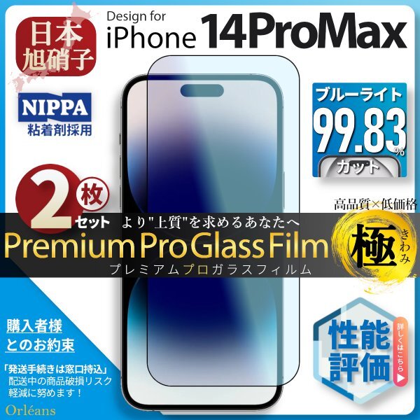 iPhone 14 ProMax ブルーライトカット 強化ガラスフィルム 超得2セット 旭硝子 全面保護 自動吸着 保護フィルム 液晶保護フィルム