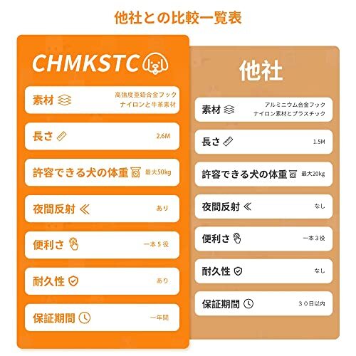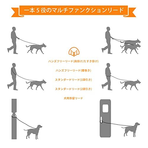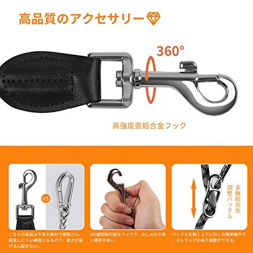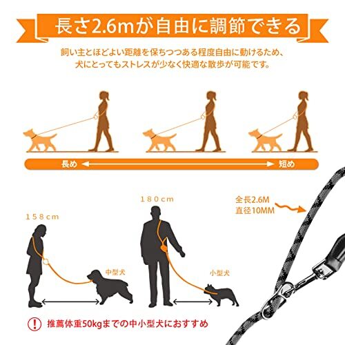 「CHMKSTC 犬リード 肩掛けリード ショルダーリード ハンズフリー犬 小・中型犬しつけ用 5in1多機能 全長2.6M 直径10MM 50k」▼▼(商品説明)・ブラック M/直径10MM ・・Size:M/直径10MMColor:ブラック・【1本あればさまざまな使い方ができる多機能リード】手で持つことはもちろん、肩と腰に掛けて使うこともできます。荷物を持ちたいときなどに、両手をフリーにすることができるので便利です。また、2頭のわんちゃんを同時に繋いでお散歩することもできるので、多頭飼いしている方にもおすすめです。・【360度回転式ナスカンと自由調整のバックル】リードを繋ぐナスカンには、最大200kgの引っ張りテストにもクリアした高強度の亜鉛合金を採用。そして360°回転できの上に、ナスカンの周りに高品質の牛革の素材で補充されるので、犬が全力で走り回ったり暴れても全然大丈夫です。長さ調整用のバックルはお好みの長さに調節可能で、オーナ様や犬の体格、お好みの散歩スタイルに合わせて調節でできます。 そして、体型が違う家族でシェアして使えます。・【丈夫で安全、握り心地もいいスタンダードリード】本犬リードは環境に優しい高品質ナイロンテープで作れれたもので、ペットが舐めても大丈夫です。生地が柔らかいので、ペットの肌に優しいです。すっきりと