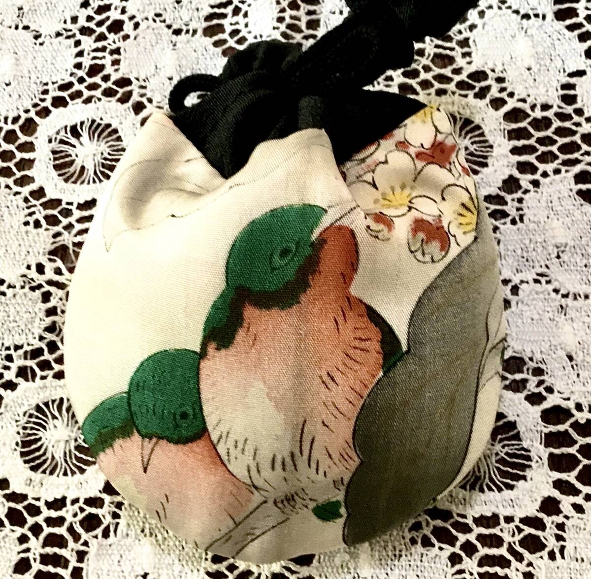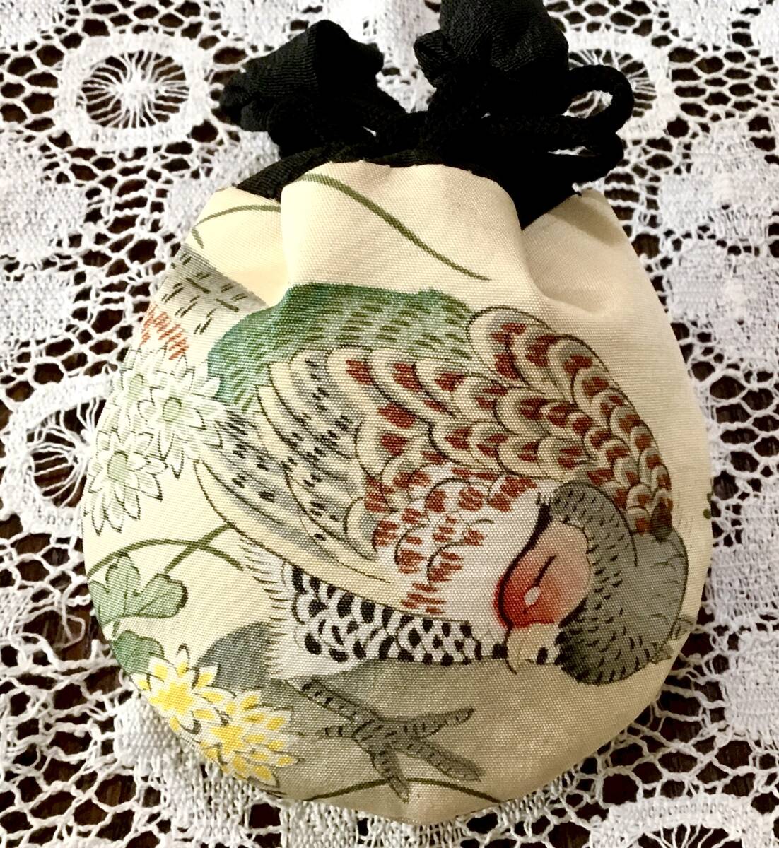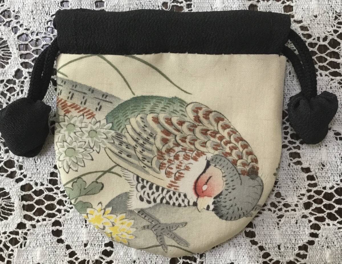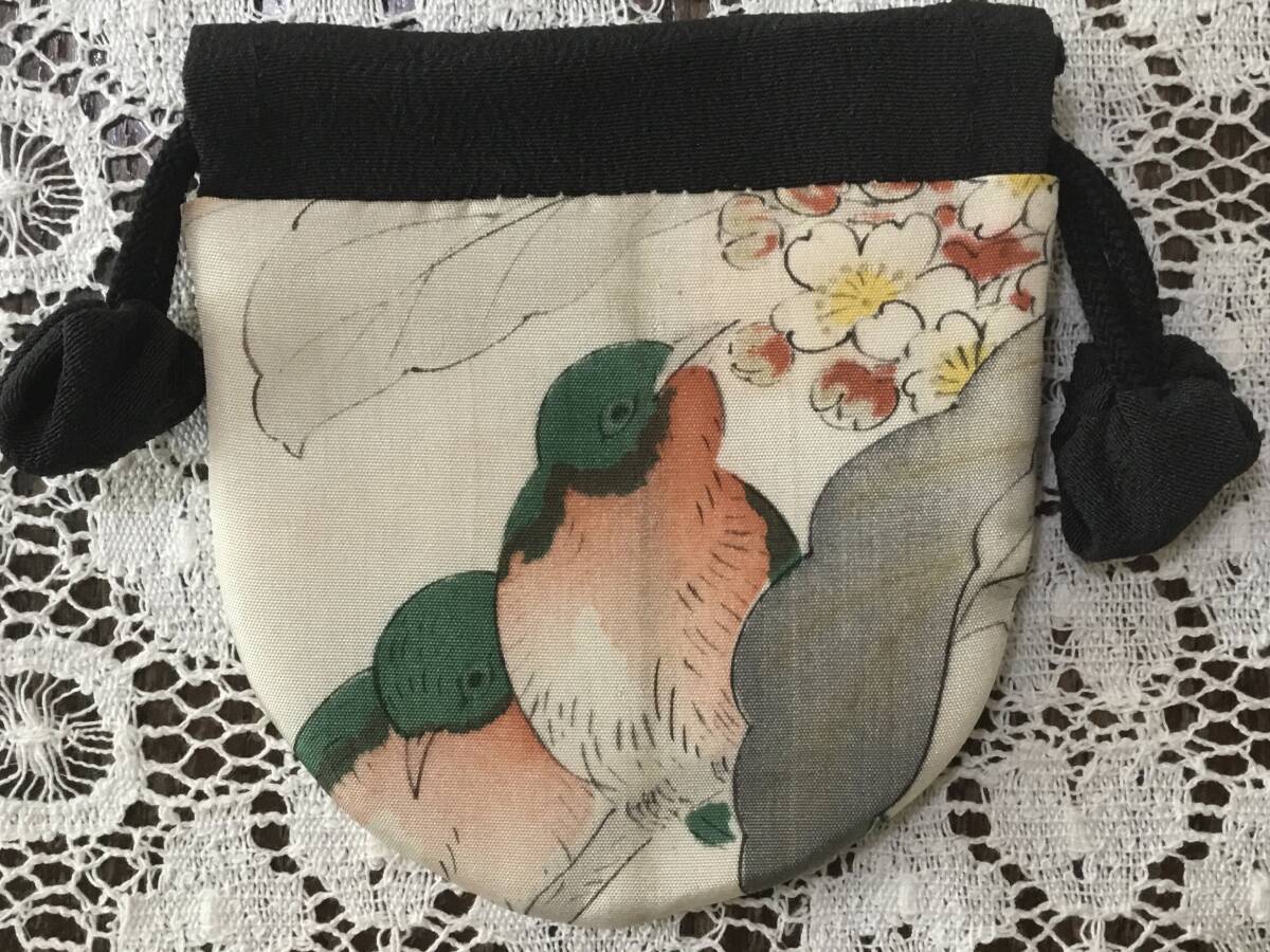 ■時代物の正絹着物地(白地に繊細に描かれた鳥柄。・・・羽二重・縦線の折染み有ります)で作った、とっても可愛いキルト小袋です。