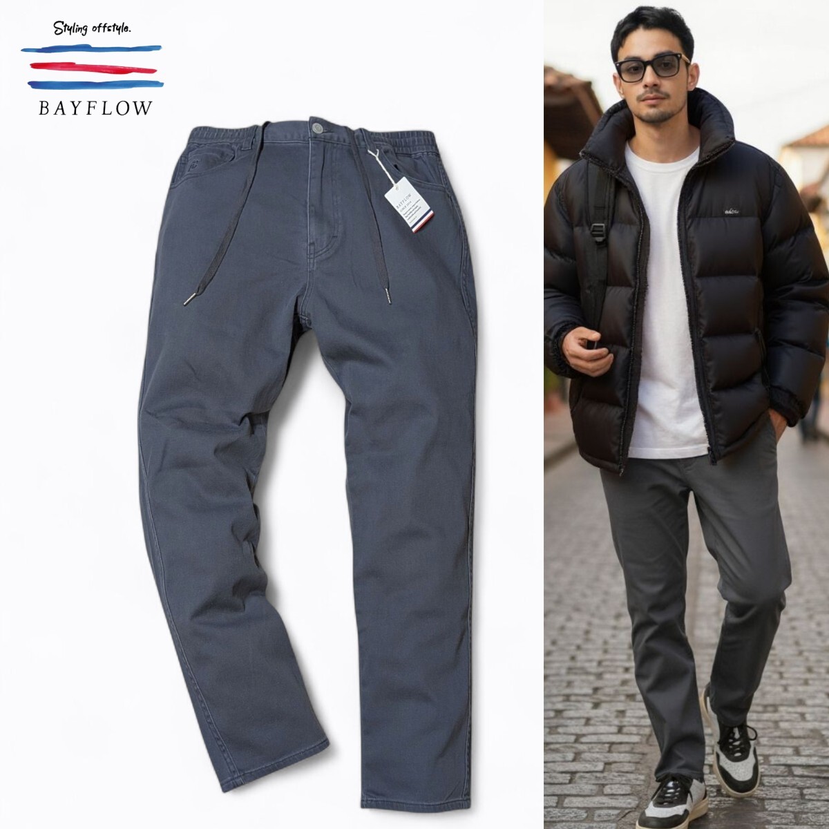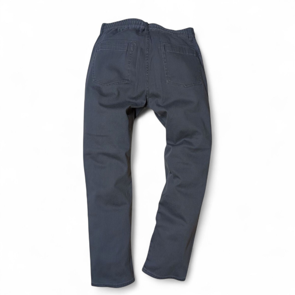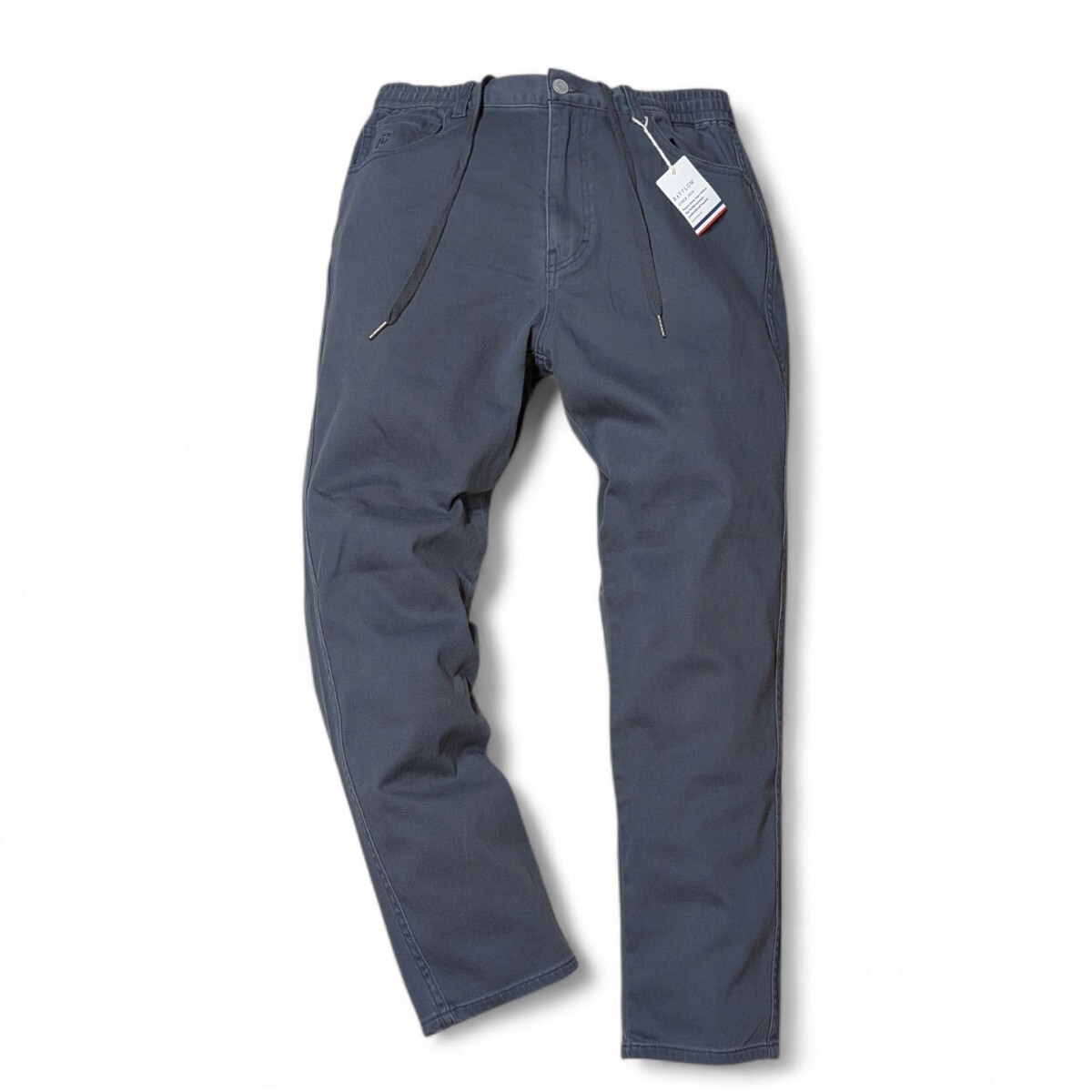 普遍的な5ポケットデザインながら、ゴム紐入りのイージー仕様で着脱も楽チン。ヒップと太もも周りは程よいゆとりがあり、裾に向かってすっきりとしたシルエットになるように調整したスリムパンツです。