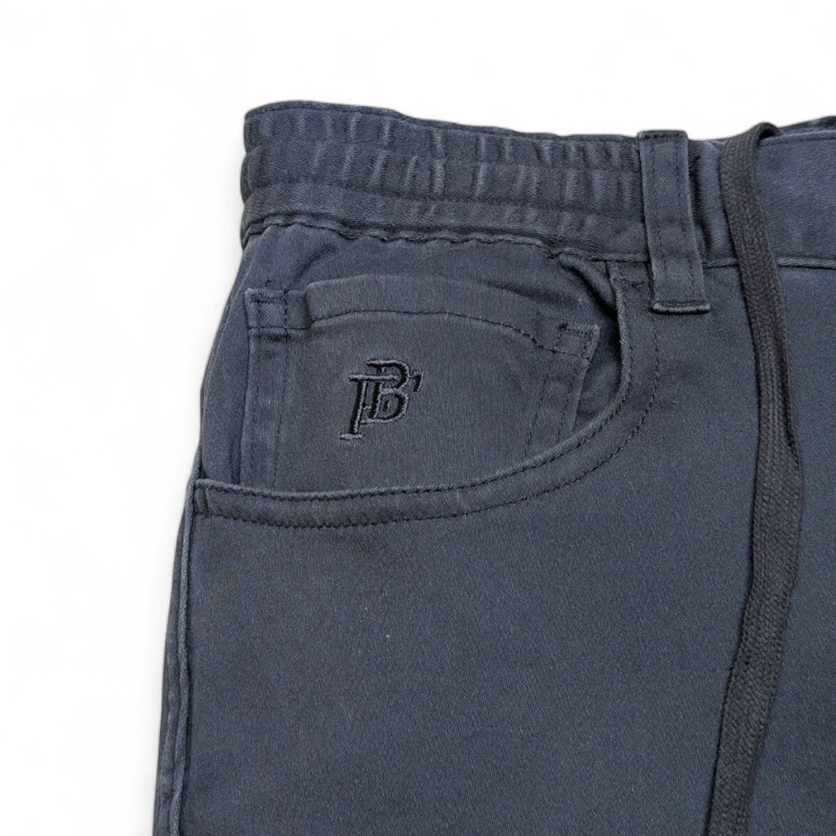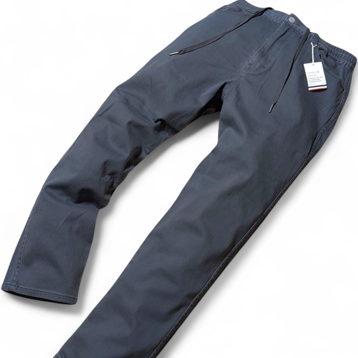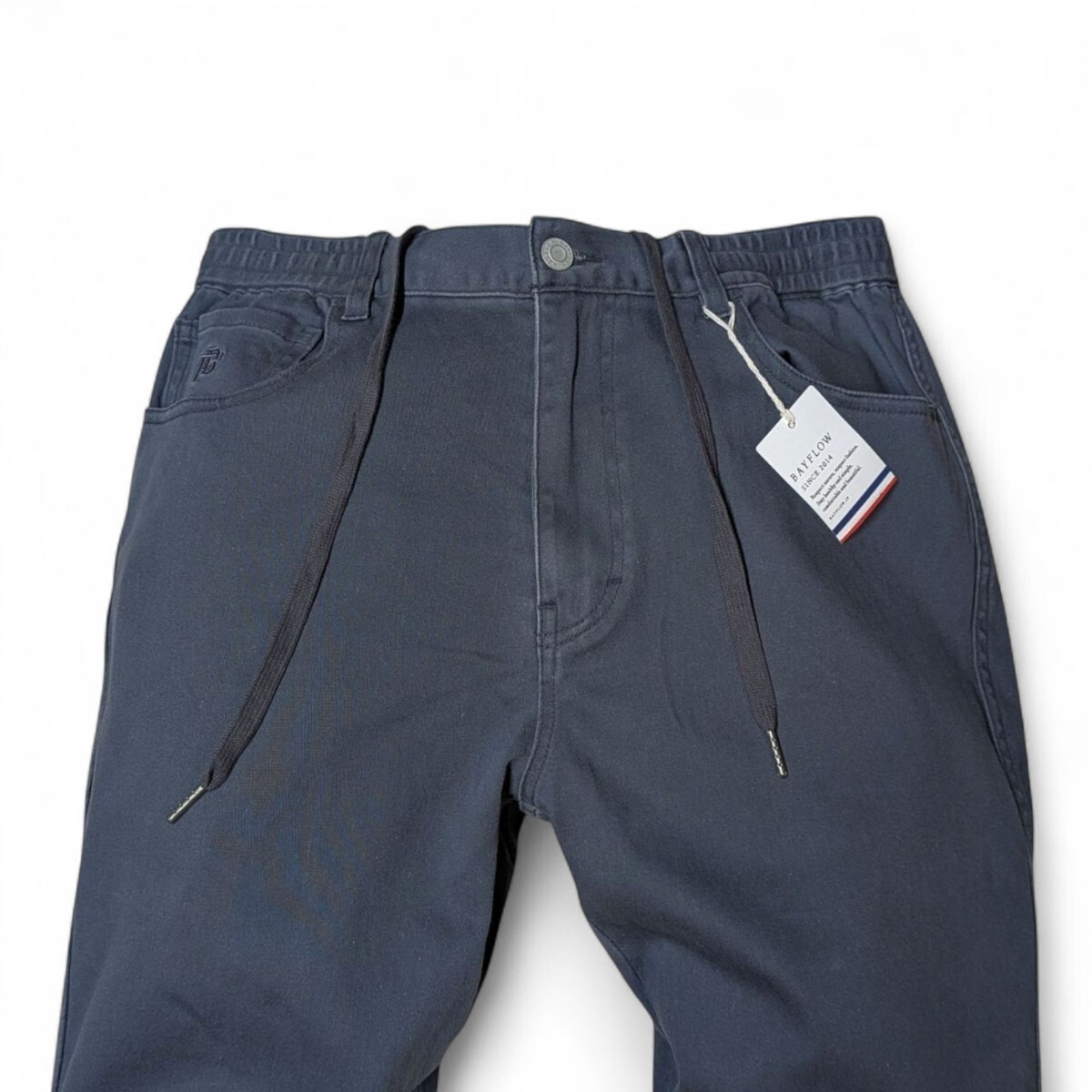 普遍的な5ポケットデザインながら、ゴム紐入りのイージー仕様で着脱も楽チン。ヒップと太もも周りは程よいゆとりがあり、裾に向かってすっきりとしたシルエットになるように調整したスリムパンツです。