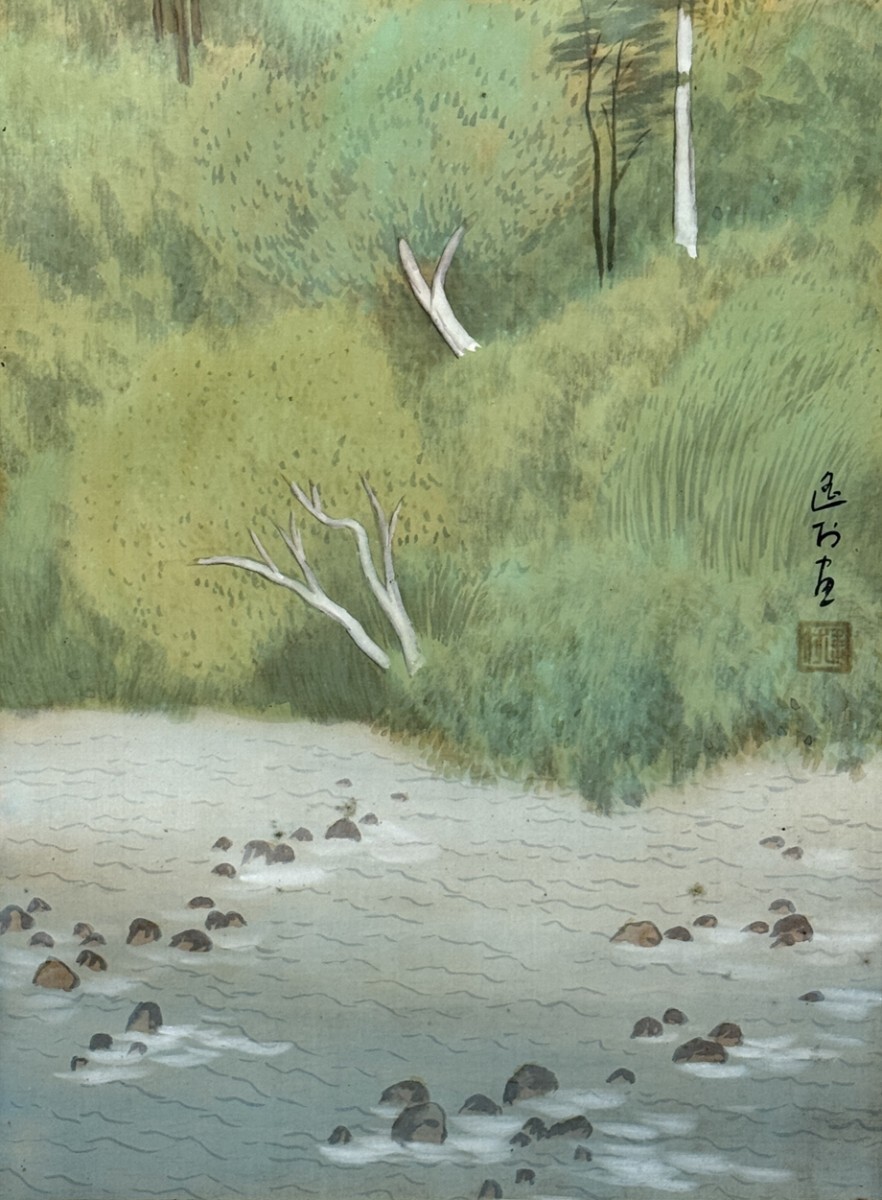 総丈サイズ…横 48 × 縦 156.5 cm 絹本着色・共箱 若年作 自筆書翰有 状態…微少オレ 本紙少シミ 【印刷ではありません】 【真作】 池田遙邨 日本画家。岡山県生。名は昇一。京都絵専卒。初め松原三五郎の天彩画塾で洋画を学ぶが、のち日本画に転向、竹内栖鳳の竹杖会に入門する。冨田渓仙の影響を受けた鳥瞰図法による明るい色彩の風景画で独自の画境を開く。上村松篁らと水明会を、浜田観らと葱青社を結成、また画塾青塔社を主催し後進の育成にあたる。新文展・日展審査員を歴任。日展顧問・芸術院会員。文化功労者。文化勲章受章。昭和63年(1988)歿、93歳。 |