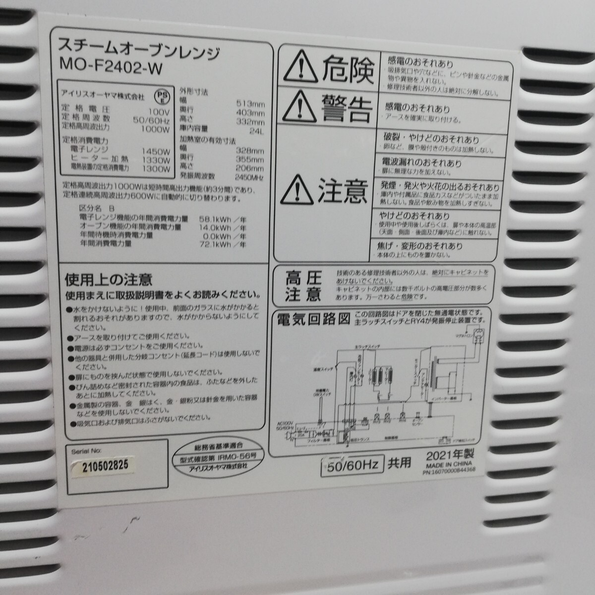 管128(2021年製.中古現状、東大阪市渋川町引取大歓迎)IRIS OHYAMA アイリスオーヤマ スチームオーブンレンジ 50Hz/60Hz共用 MO-F2402-W