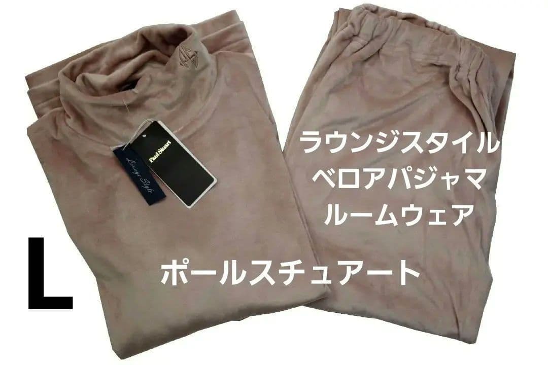 ●ポールスチュアートPaul Stuart のラウンジスタイル。ベロアパジャマ、ルームウェア(L)新品です。プルオーバー、長袖、ロングパンツ。色はピンクベージュで光沢があります。サイズはLでバスト86-94㎝。 素材はポリエステル95%、ポリウレタン5%で 両面起毛の ソフトベロアです。 正規ライセンス会社扱い品です。