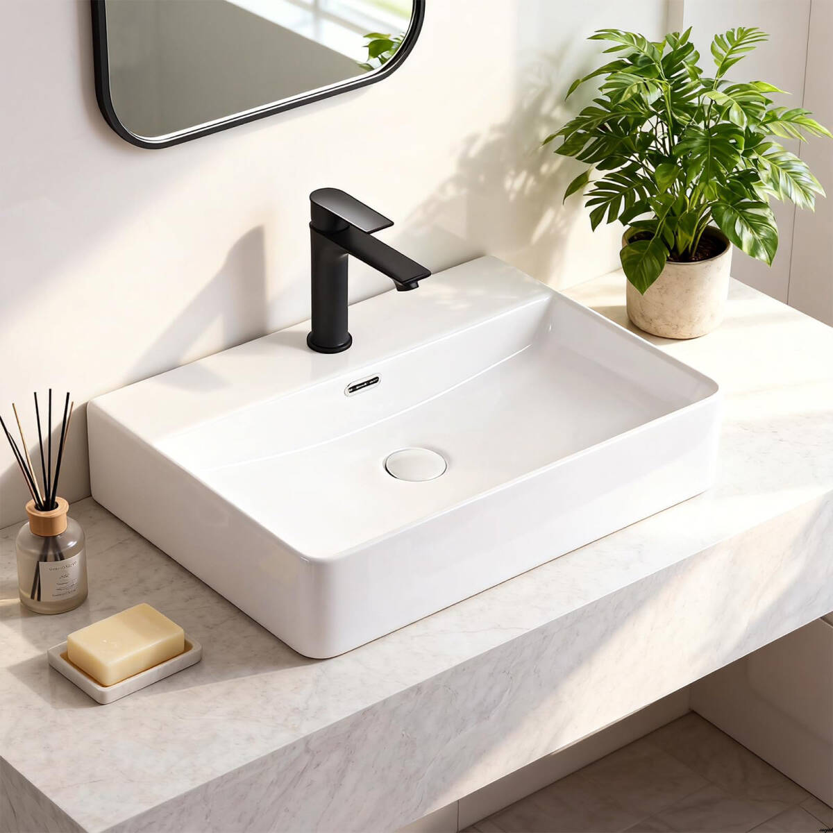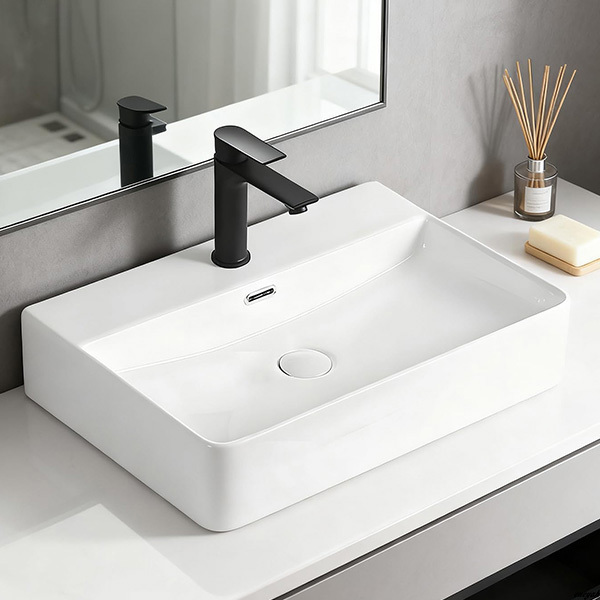 シンプルな長方形デザインと陶器の落ち着いた質感は、住宅からホテル、サロンまで幅広い空間に自然に馴染みます。