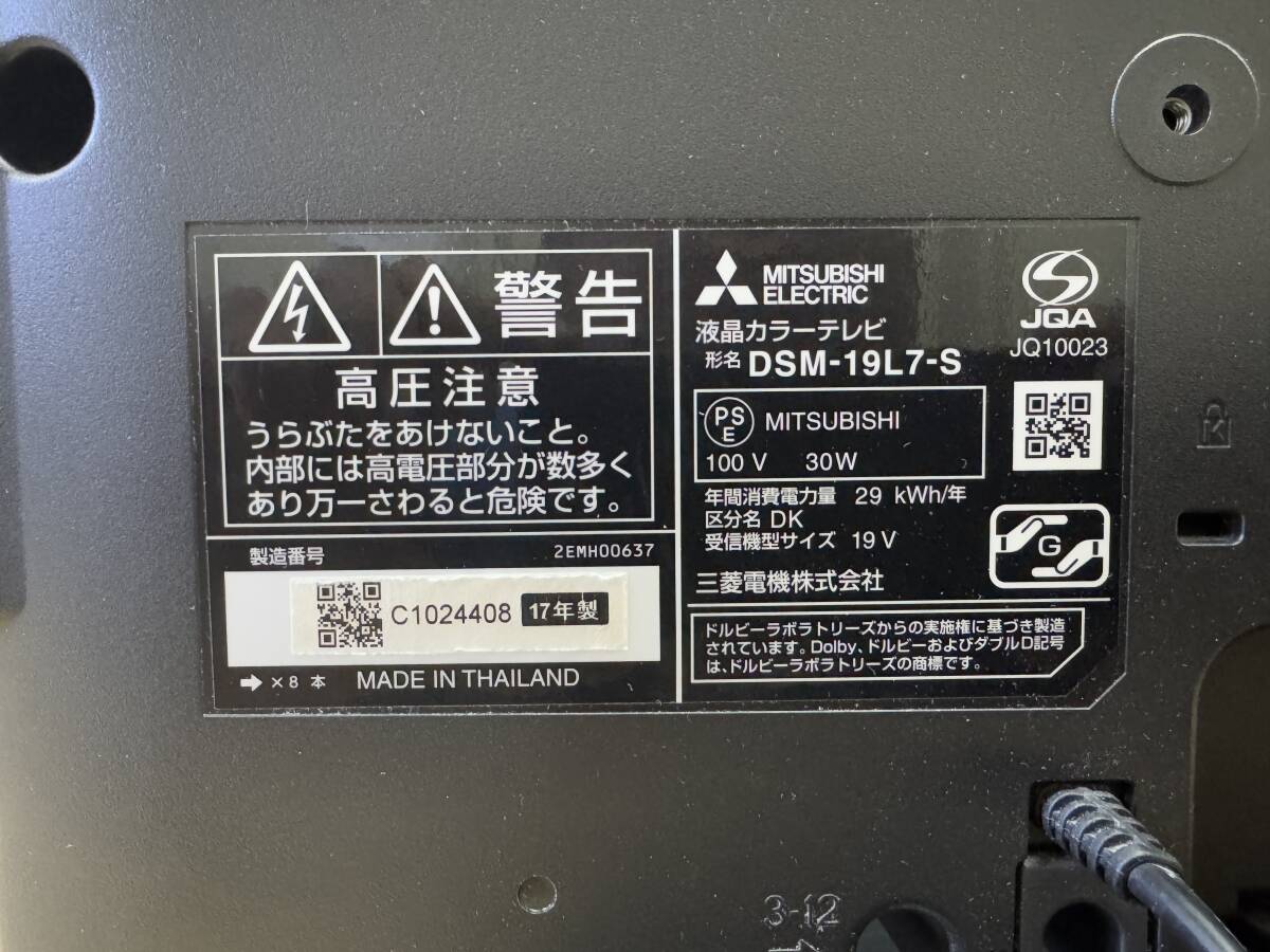 19型 三菱 2017年製 液晶テレビ DSM-19L7-S 管理番号F1881