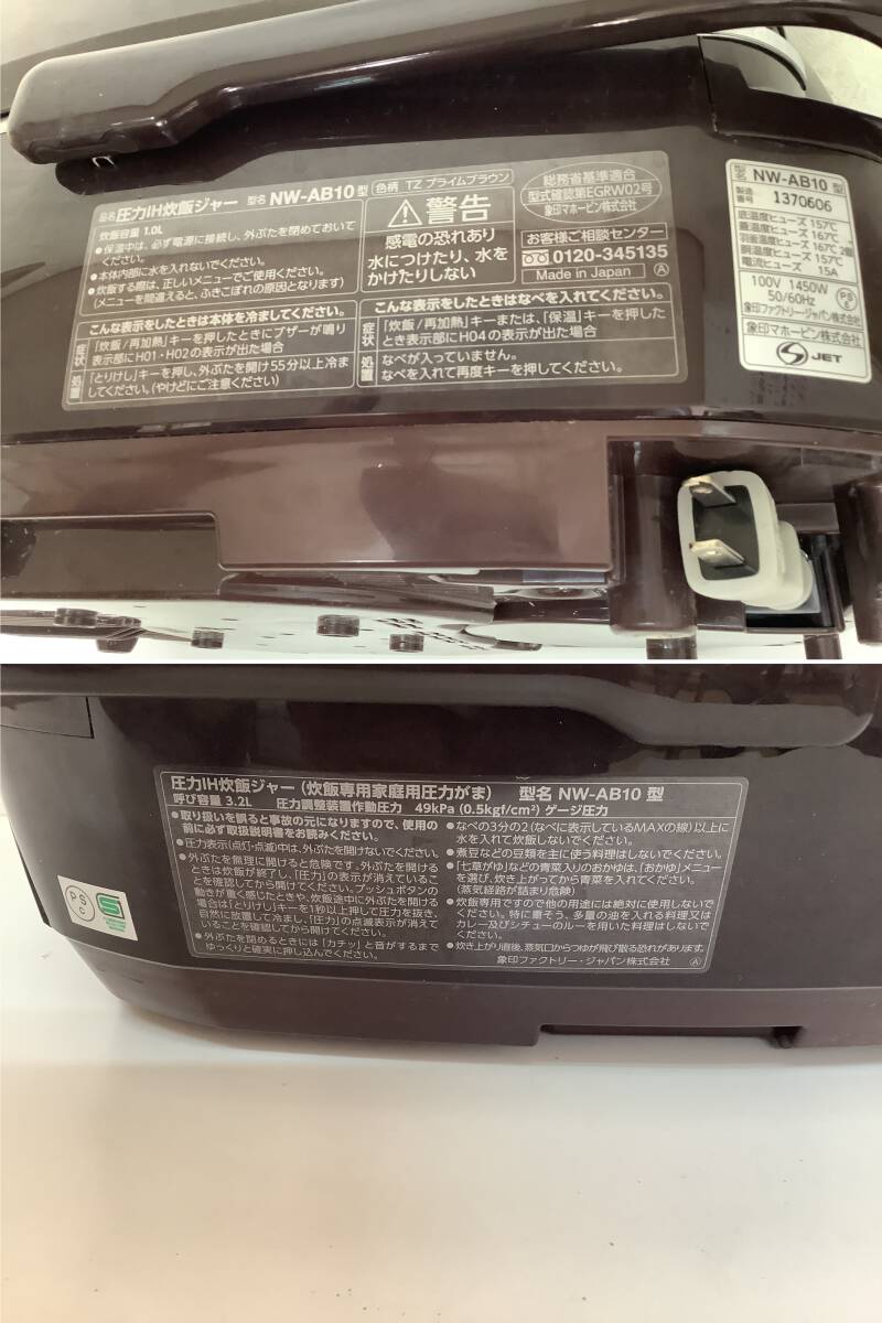 ■ス-309 中古品 ZOJIRUSHI NW-AB10 動作確認・簡易清掃済み 圧力IH炊飯ジャー 2017年製 1.0L プライムブラウン 象印