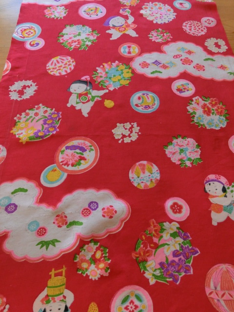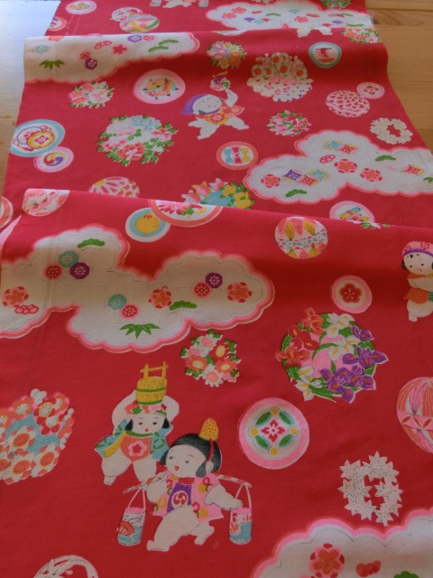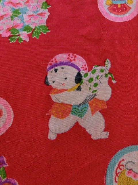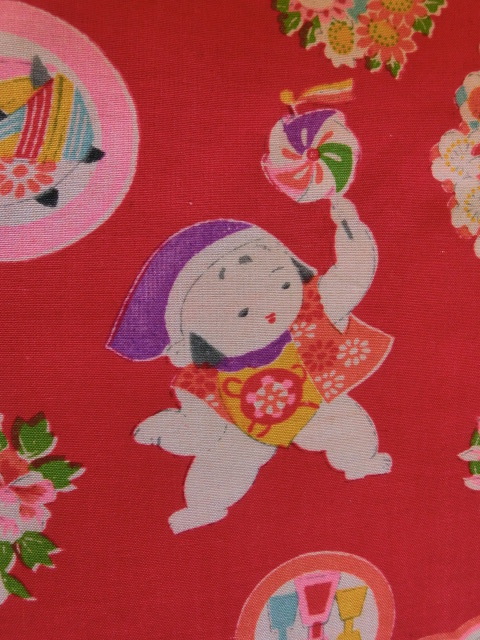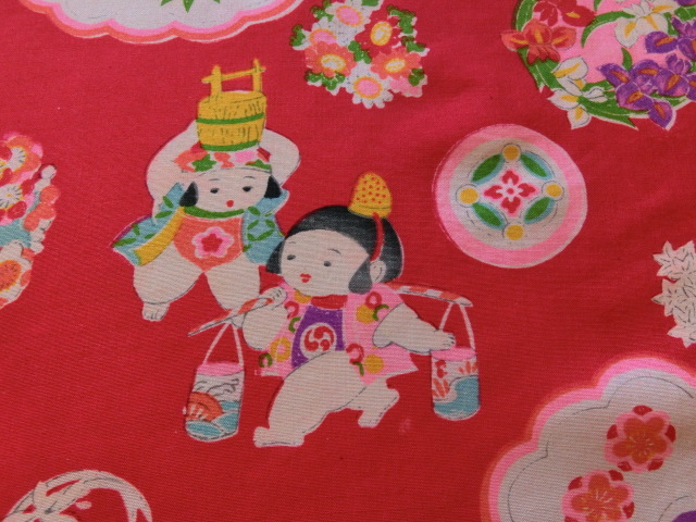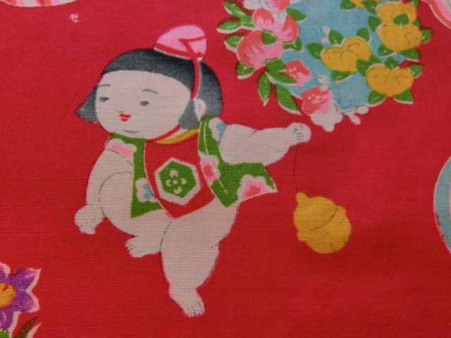 赤地に色々なポーズの童子たちが可愛らしい絹地です。