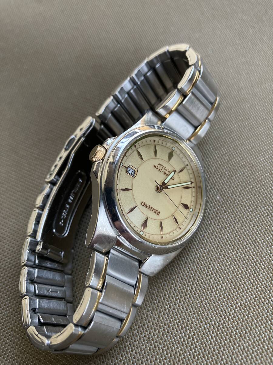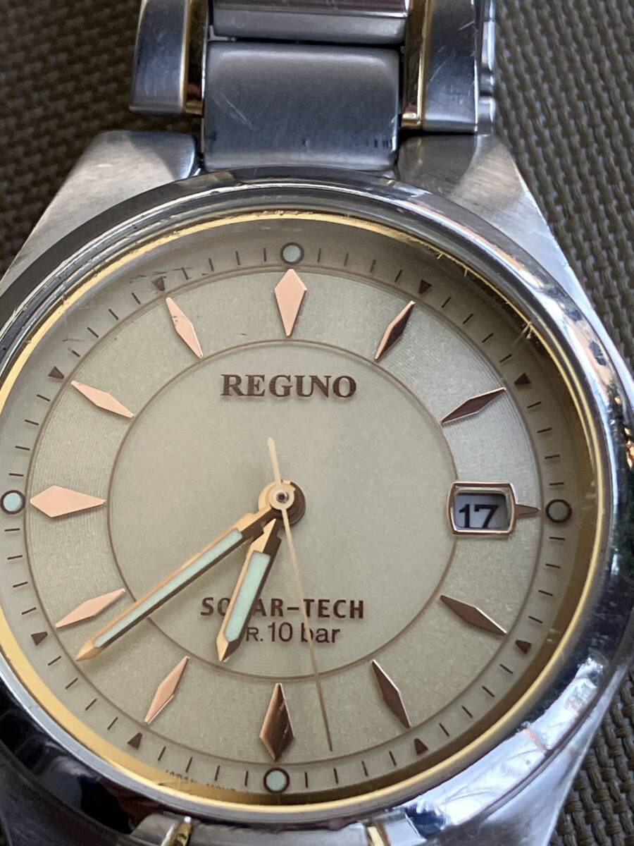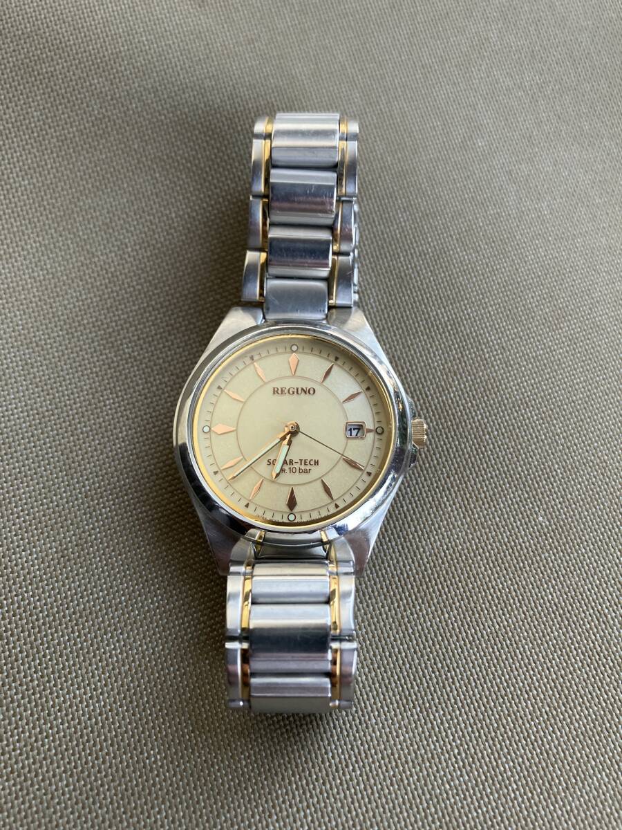 REGUNO SOLAR TECH です。現在稼働中 全体的に細かい傷ありますが日常等充分使える程度かと思います ベルト社外腕周り最大19.5cm 状態は写真にてご確認下さい 中古品の為NC NRにて宜しくお願い致します