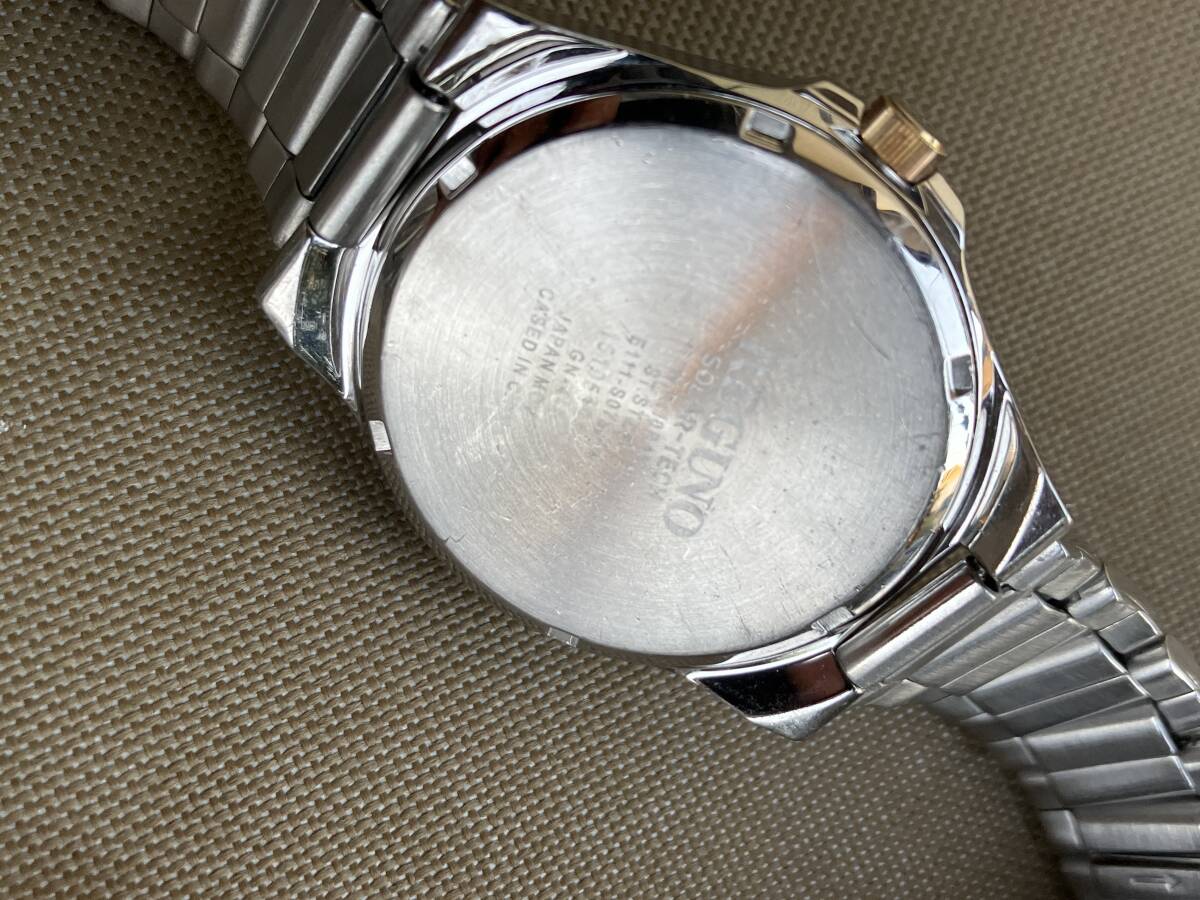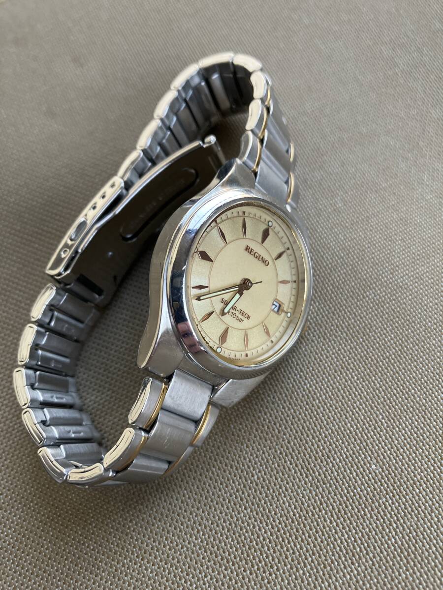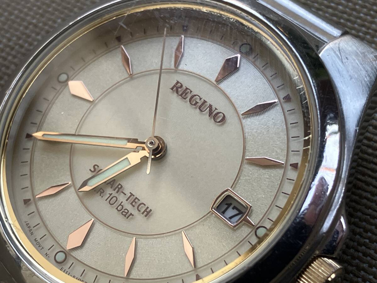 REGUNO SOLAR TECH です。現在稼働中 全体的に細かい傷ありますが日常等充分使える程度かと思います ベルト社外腕周り最大19.5cm 状態は写真にてご確認下さい 中古品の為NC NRにて宜しくお願い致します