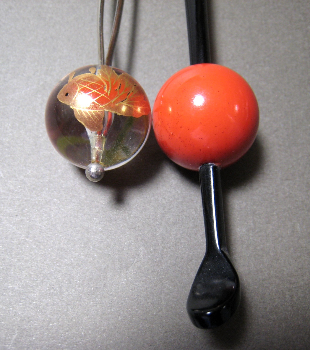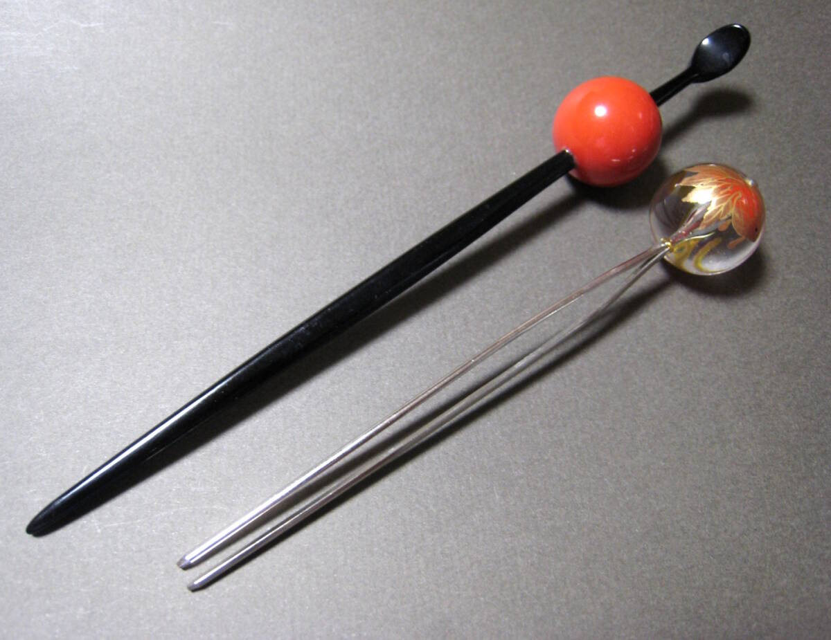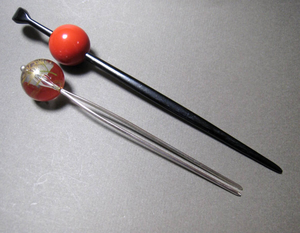 金魚と水草の絵付けが可愛いクリアな玉簪と黒軸に赤い玉飾りの玉簪の2点です。材質は樹脂製
