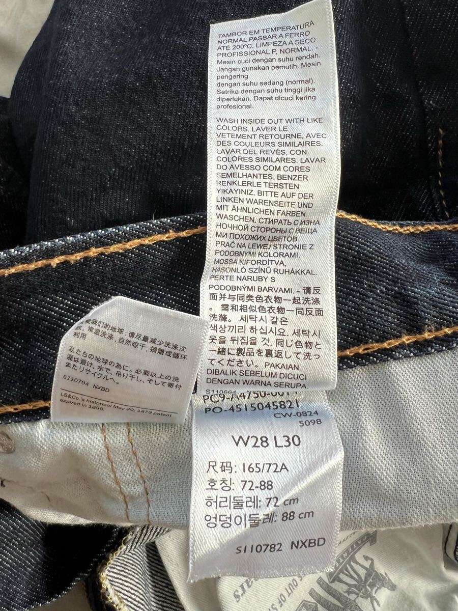 サイズは28インチ、参考までに平置き採寸にてウエスト37センチ、裾幅21センチ、股下68センチ、前股上28センチ、後ろ股上40センチです。ワイドでありながら裾に向かってテーパードされており何にでも合わせやすいデニムと思います。あくまで中古扱いにつきノークレームノーリターンです。その他にも出品しておりますのでぜひご覧ください。