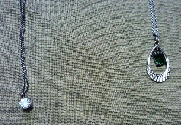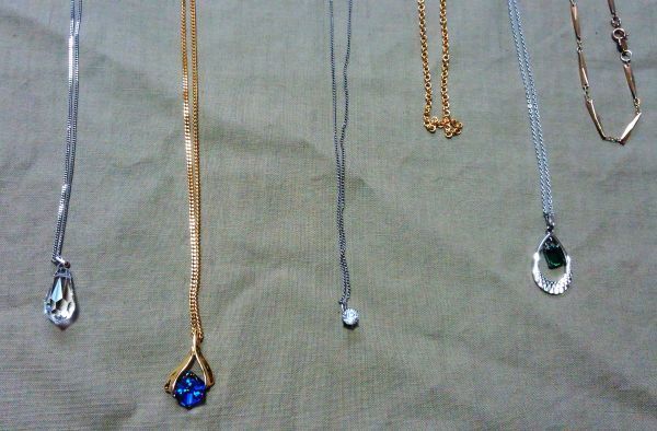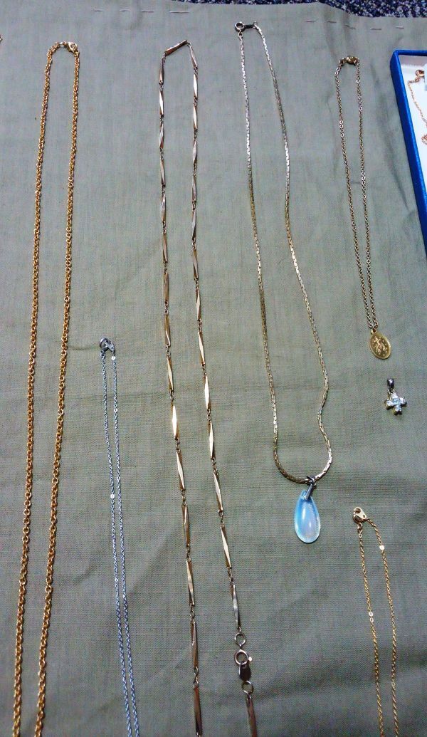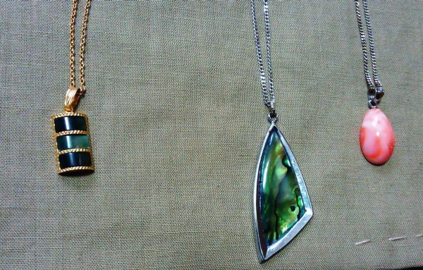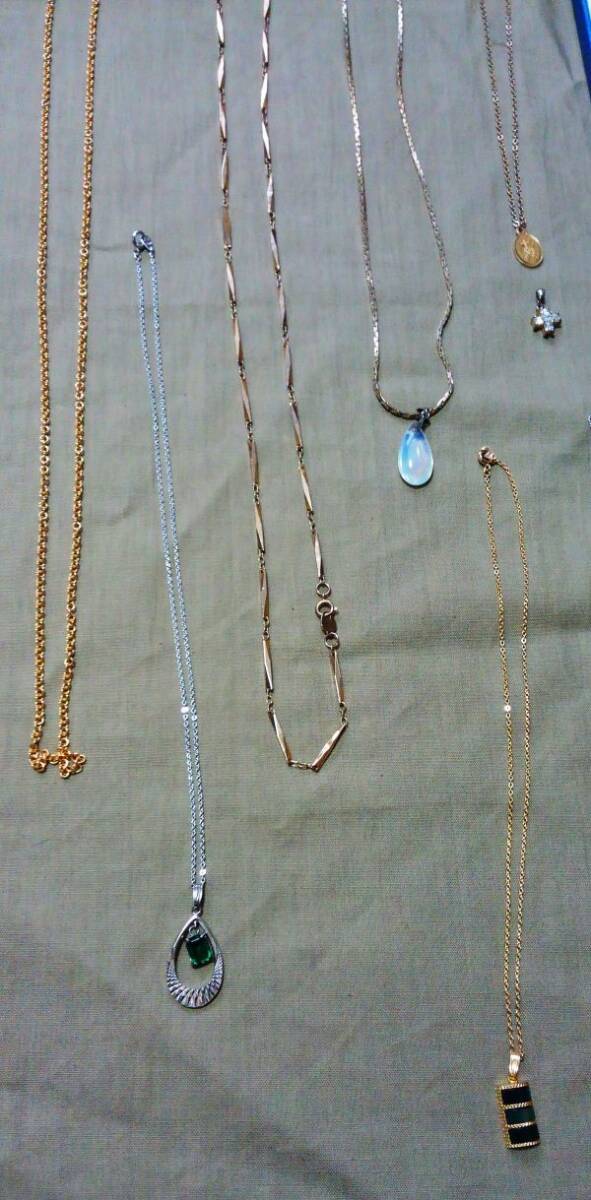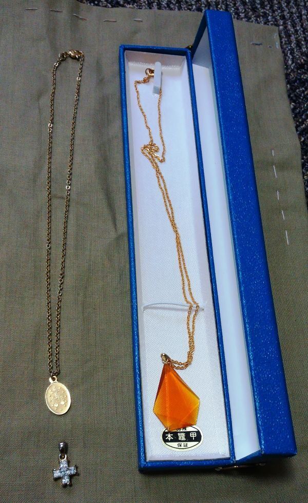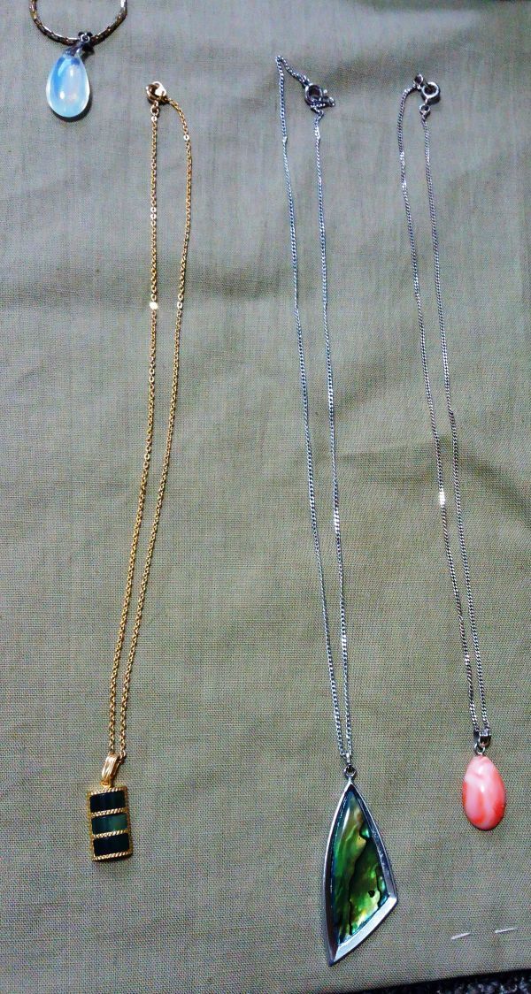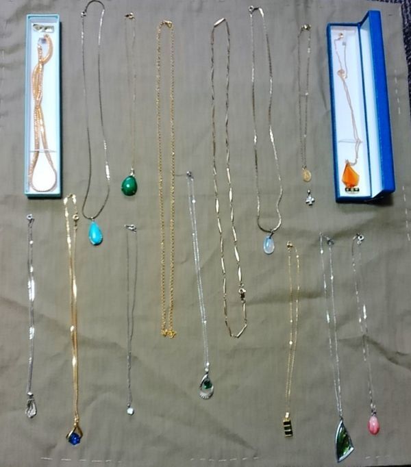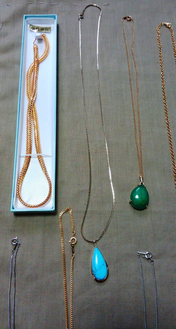 チェーンは金メッキ・銀製など色々です。トップはプラスチック、べっこう、アベンチュリン(インド翡翠)、トルコ石(人造の可能性大)、貝(経年に伴う劣化変色あり)など他にも色々です。経年劣化、使用傷などがあります。ノーリターンノークレームの守れる人にお譲りします。