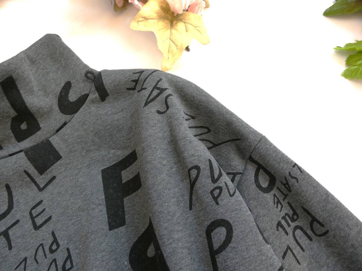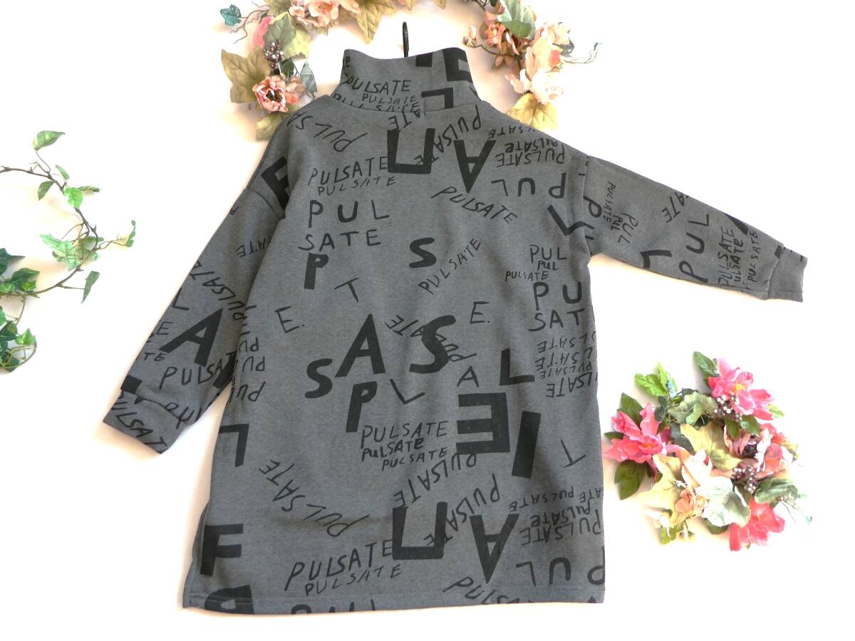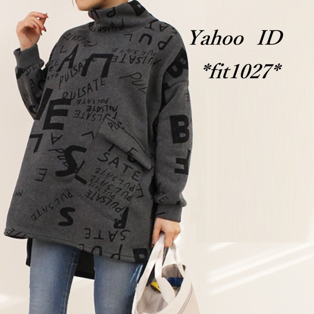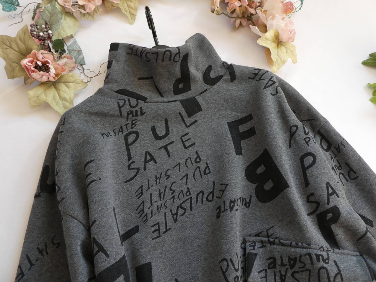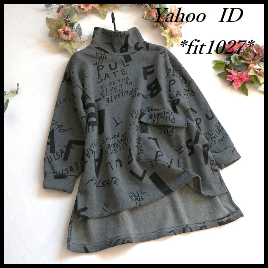 ゆったりサイズ【新品】裏起毛ニットソー素材♪英字アートプリント◇タートルネック☆ポケット付きチュニック・グレー×黒◆fit1027◆
