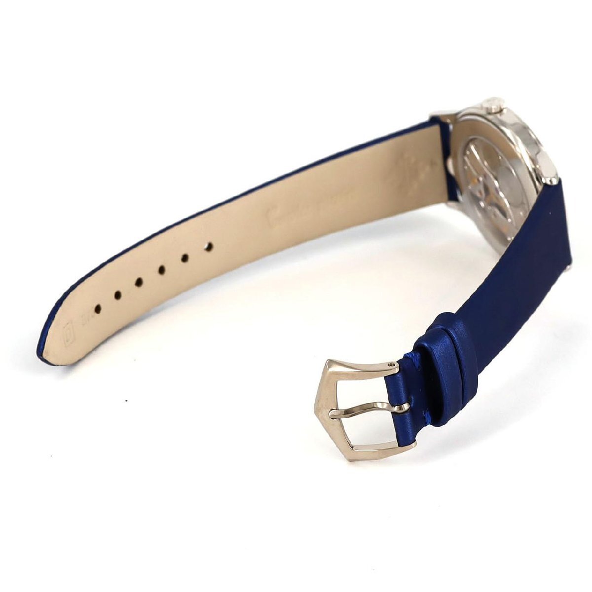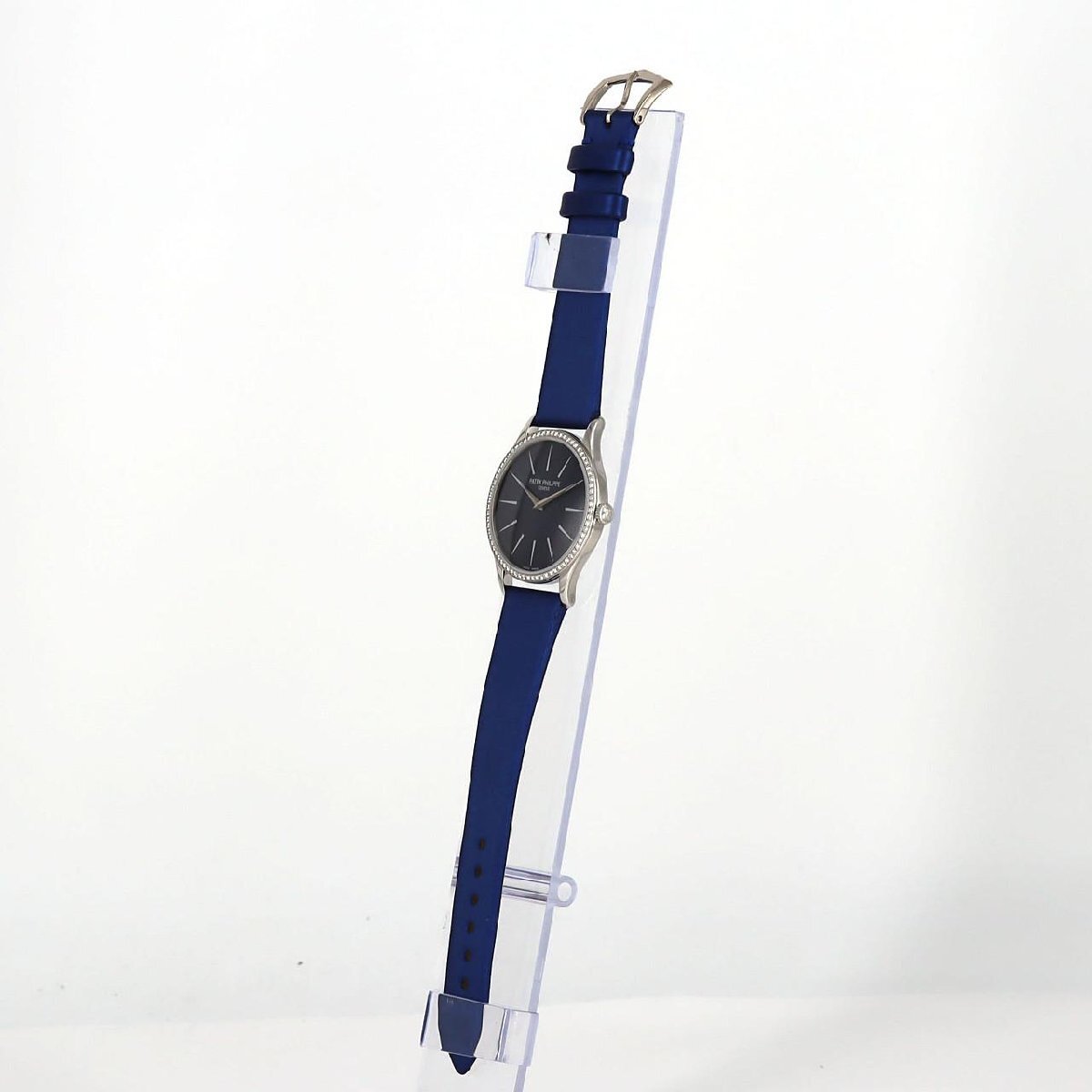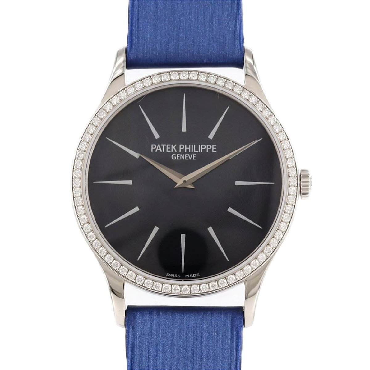 パテックフィリップを代表するモデル「カラトラバ」のRef.4897G-001が入荷いたしました。ブルー文字盤には繊細なサンレイ加工が施され、ベゼルにダイヤモンドがセッティングされている大変美しいモデルです。薄型ケースにキャリバー215を搭載しており、シースルーバックからムーブメントをご覧いただけます。
