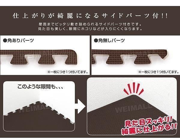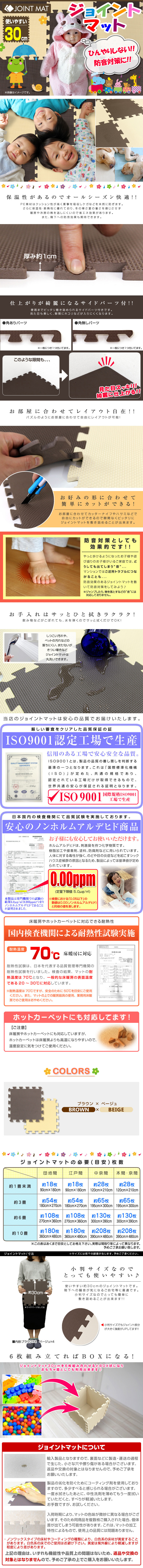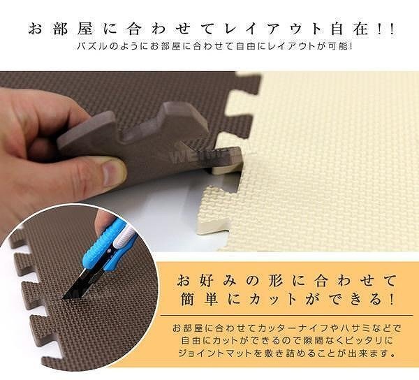 | 商品コード:FCA0230M ★商品仕様 カラー: ブラウン/ベージュ 本体サイズ(約): 幅30×奥行30×厚み1.0cm (※1枚) 素材: EVA樹脂 ★商品内容 ジョイントマット ×32枚 ├ブラウン (16枚) └ベージュ (16枚) サイドパーツ(角付きパーツ32本、角なしパーツ32本) ★注意事項 ※材質の特性上、厚みに多少の誤差がある場合がございます。 ※マットの上での暖房器具の使用、及び床暖房の使用は避けて下さい。 ※EVA樹脂の臭いが最初はある程度しますが、人体には影響ありません。 臭いによる返品はお受けできませんので、臭いの気になる方はその旨をご了承の上ご落札をお願いいたします。 ※重量物を載せますと、マットが凹み変形する恐れがあります。 ※サイドパーツ単体の販売は行っておりません。 サイドパーツをカットして使用する際はご注意下さい。 ・商品は、モニターによって色合いが異なって見える場合があります。 仕様・デザインは改良のため予告なく変更することがあります。 ▼検索キーワード ジョイントマット 3畳 6畳 8畳 12畳 防音 騒音 吸収 ジョイント マット 赤ちゃん クッションマット フロアマット パズルマット プレイマット キズ 傷 防止キッチン リビング 子供部屋 キッズ ベビー ペット 人気 おすすめ ピックアッププラザ PICKUP PLAZA |