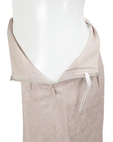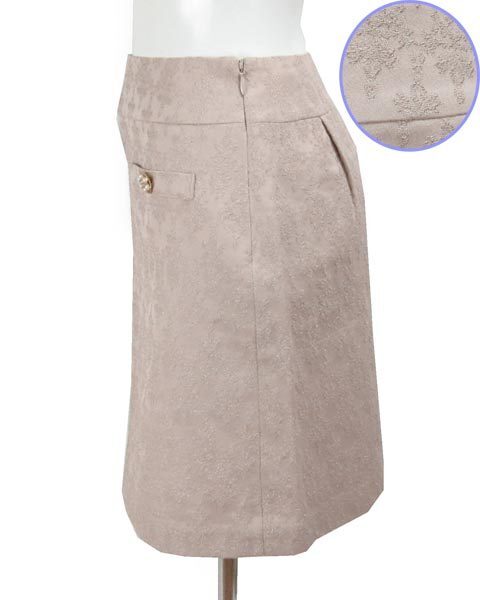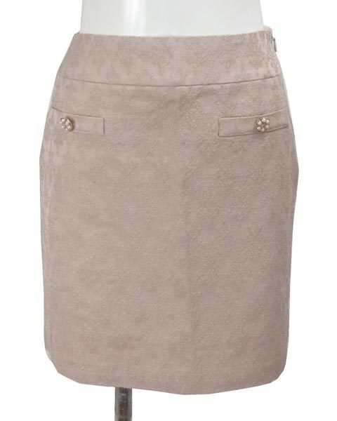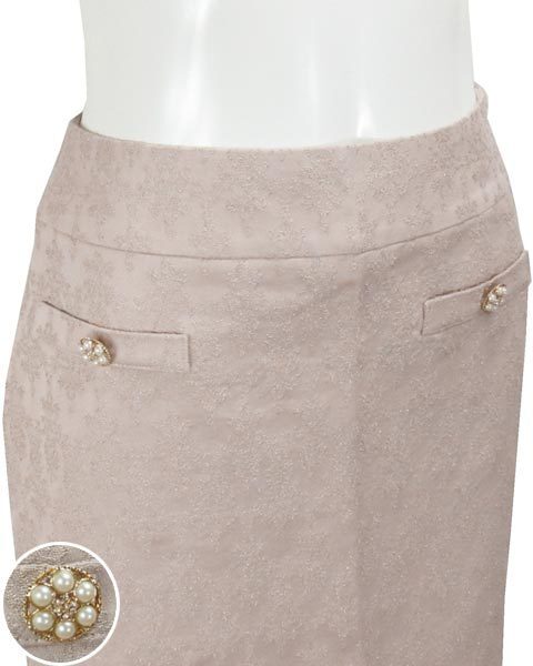 | くすみピンクベージュの上品なスカート。全体にゴールドラメの入った華やかな刺繍入り。江ふぃくポケットにはパール調ボタンがついていて女性らしい雰囲気です。春先から秋口まで活躍してくれます。 |