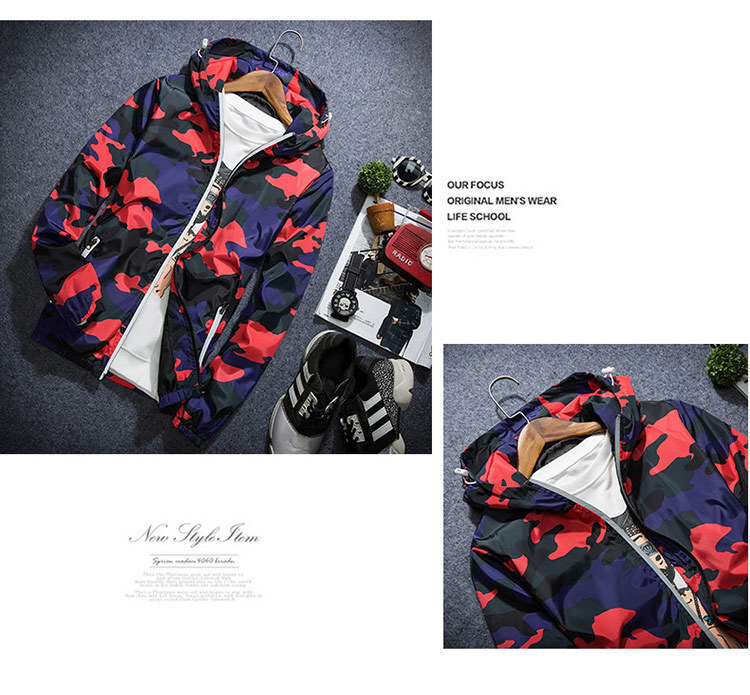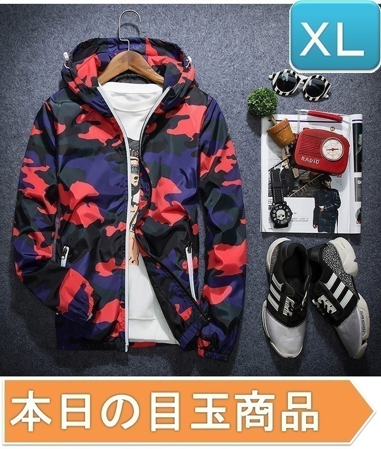 ☆1スタ 【175】 迷彩 ウィンドブレーカー フード付き レッド XL メンズ ナイロン カモフラ 柄 アウトドア 防風 軽量 ジャケット