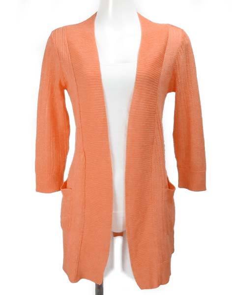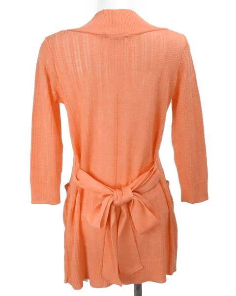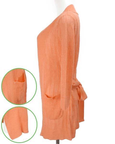 | コメント | 綺麗なシャーベットオレンジのカーディガン。 薄手のニットで、春夏の差し色としてお使いいただけます。 空調の効いた場所や、朝晩のお出かけに便利なアイテム。 付属のベルトのオンオフでも雰囲気が変わり おススメです。 |