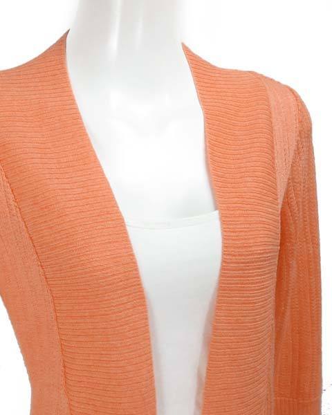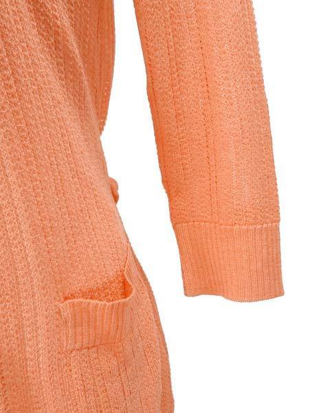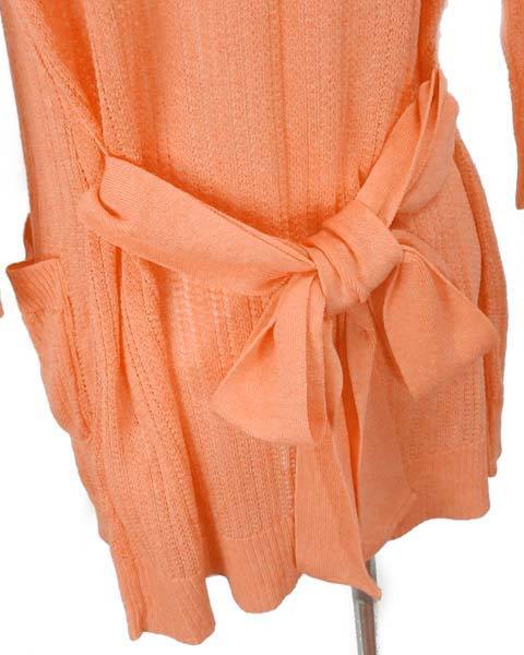 | 綺麗なシャーベットオレンジのカーディガン。薄手のニットで、春夏の差し色としてお使いいただけます。空調の効いた場所や、朝晩のお出かけに便利なアイテム。付属のベルトのオンオフでも雰囲気が変わりおススメです。 |