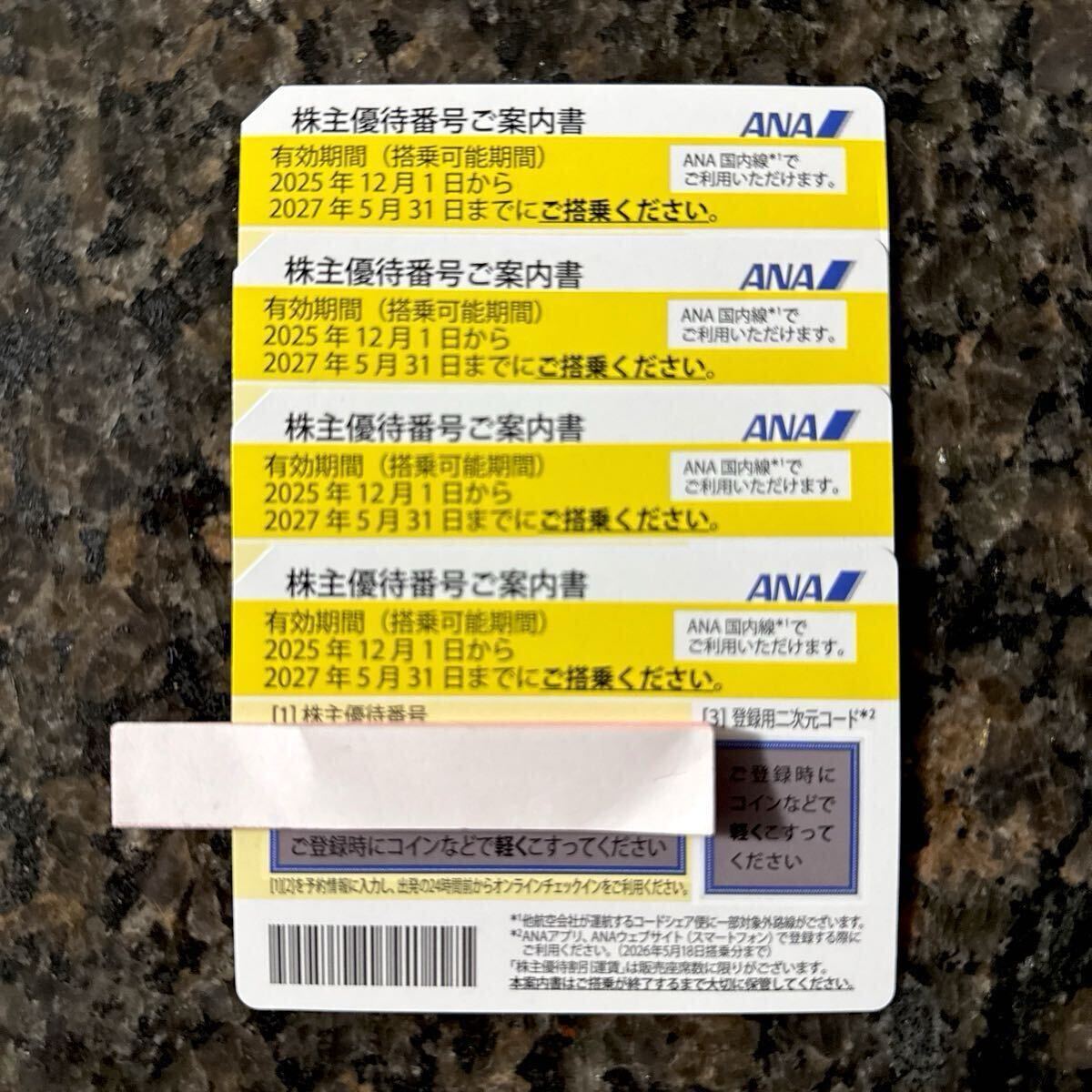 最新のANA株主優待券(株主優待番号ご案内書)の4枚セットです。ANA国内線でご利用いただけます。