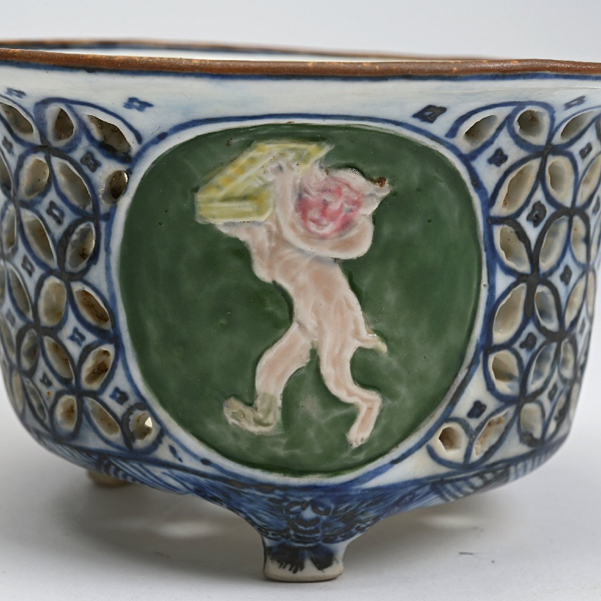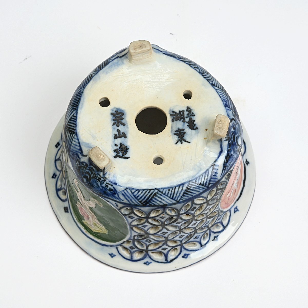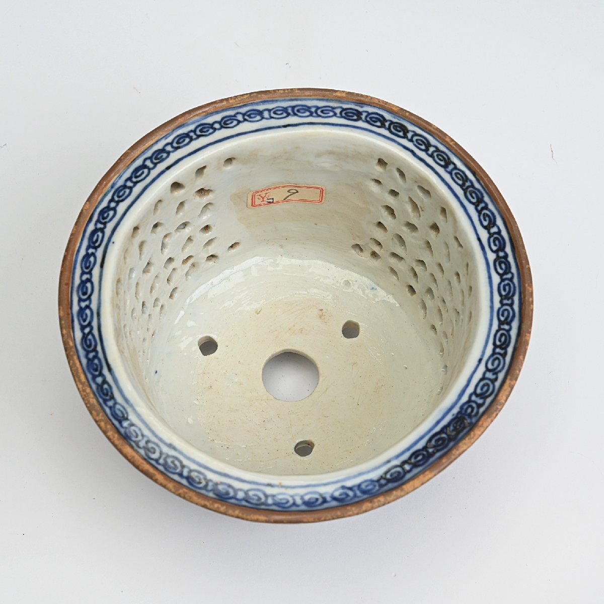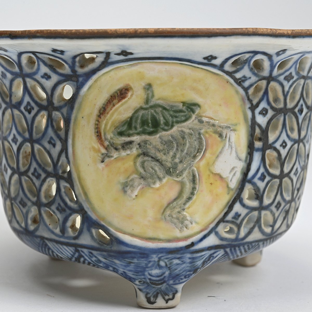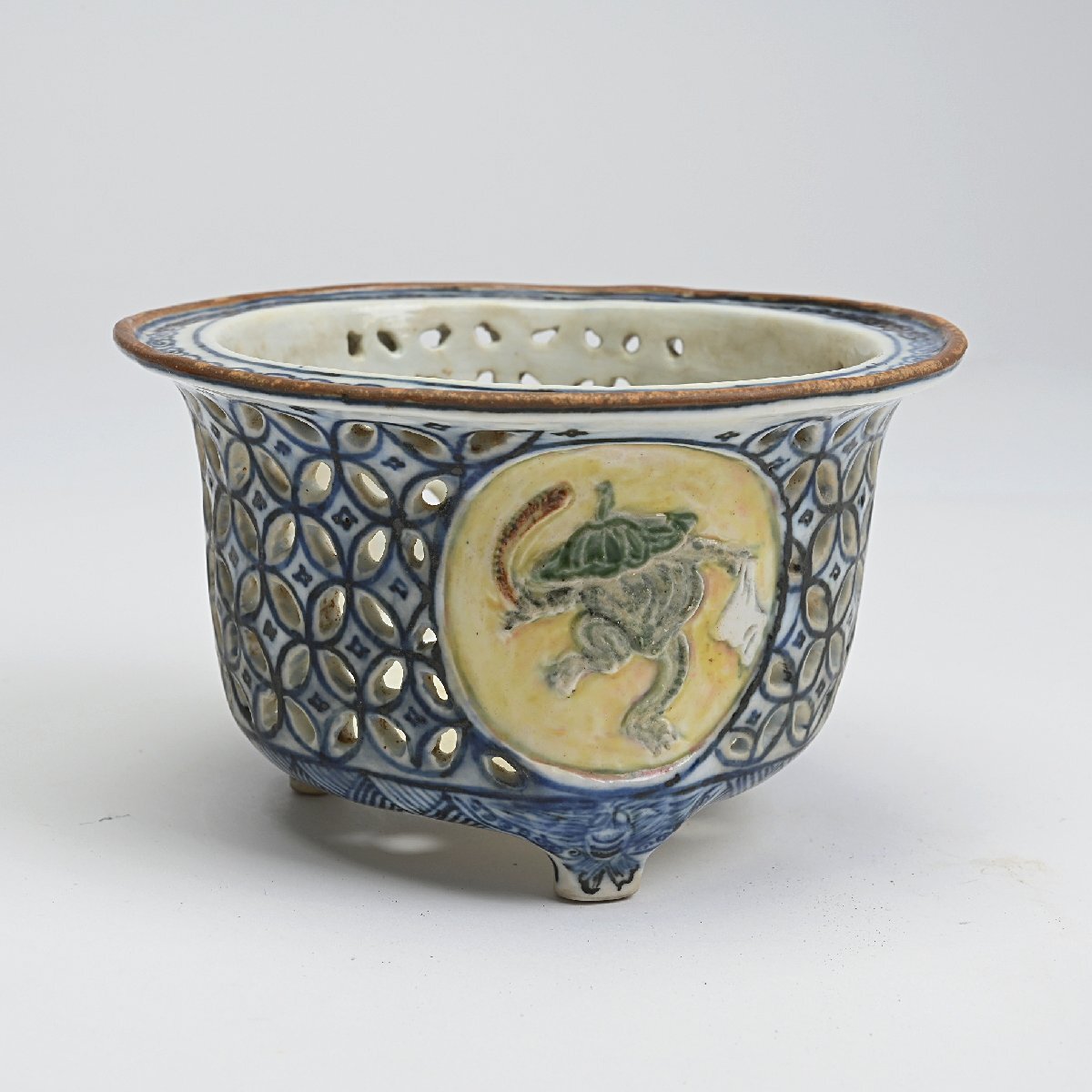 ITIL016 小品盆栽鉢 16 奥村宗山 造 金亀湖東 猿、兎、蛙文 七宝紋透かし 丸型
