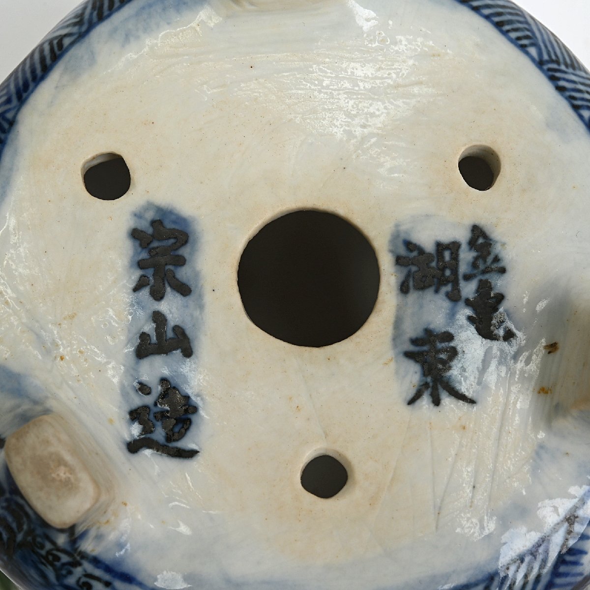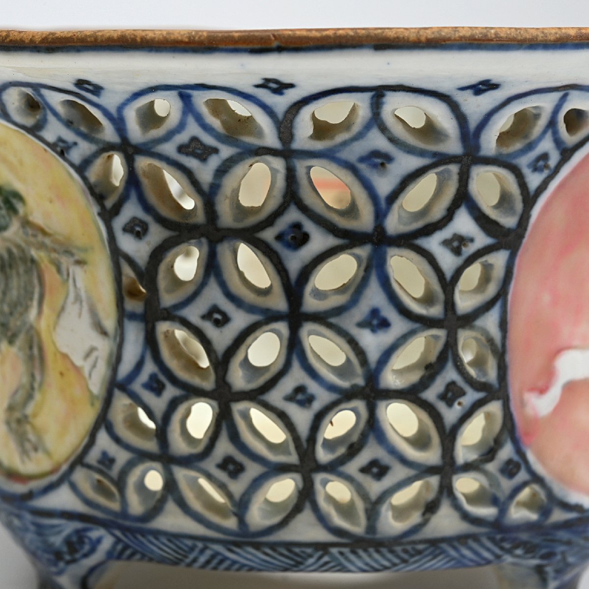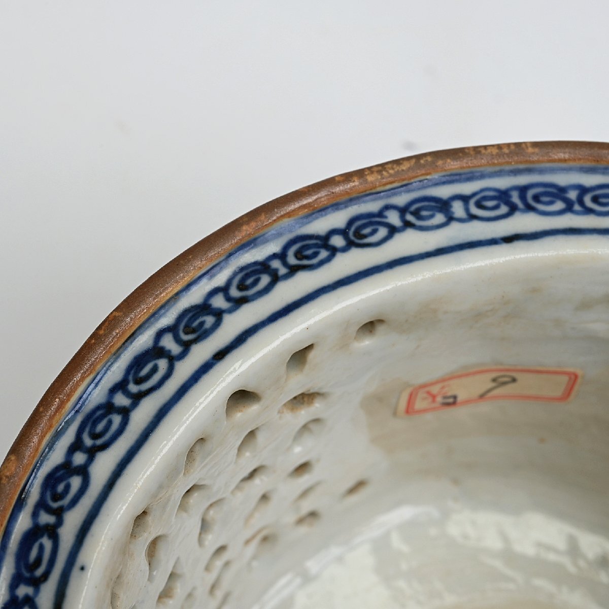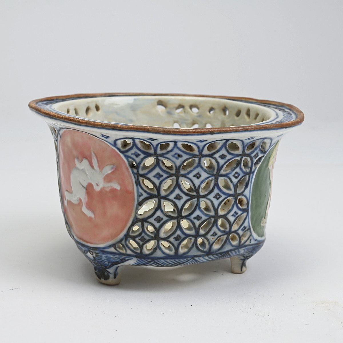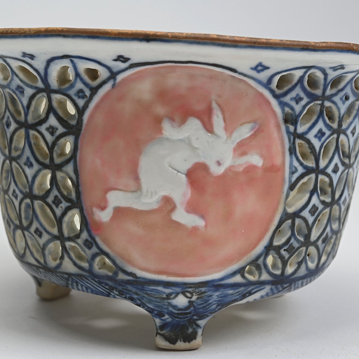 ITIL016 小品盆栽鉢 16 奥村宗山 造 金亀湖東 猿、兎、蛙文 七宝紋透かし 丸型