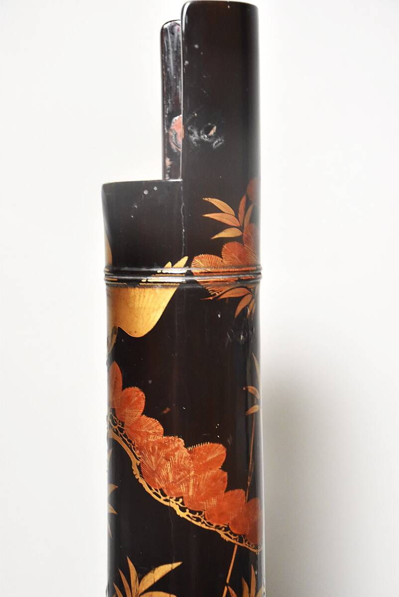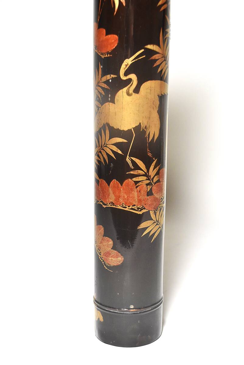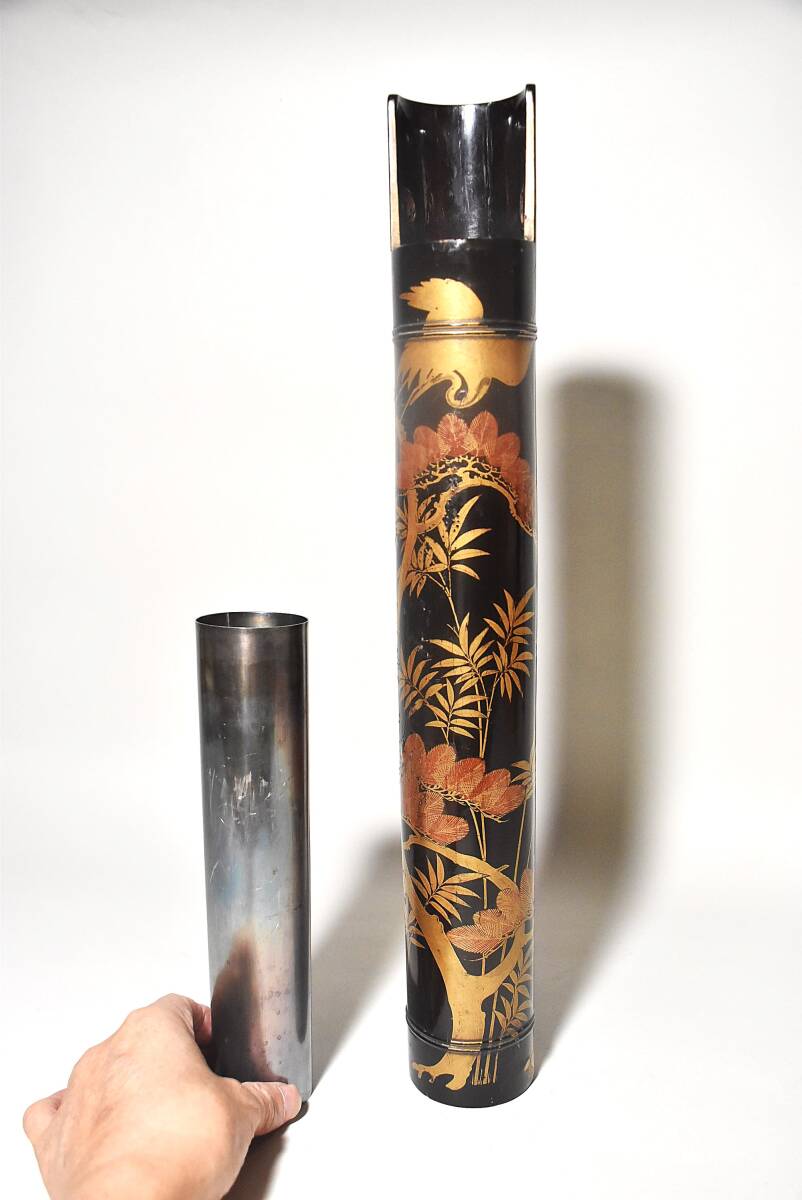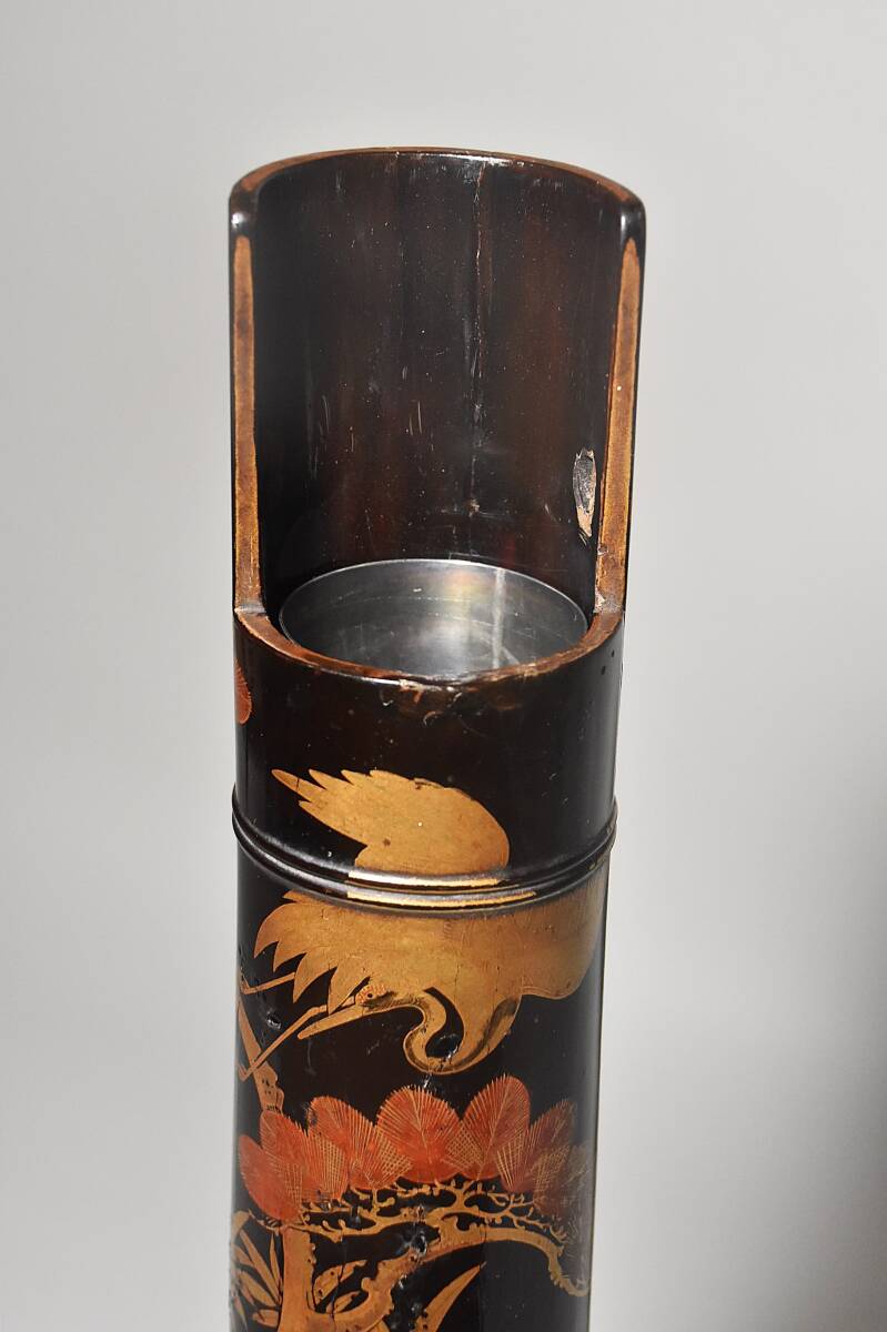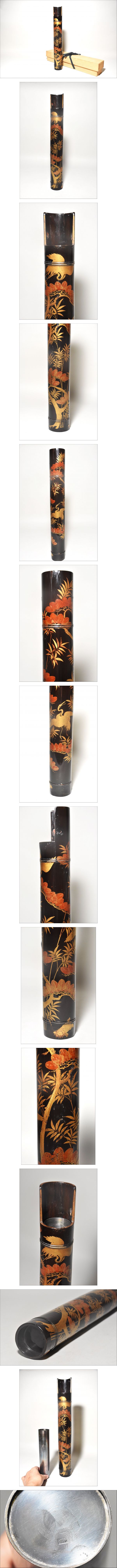 「時代蒔絵筒花器(江戸時代)」です。 江戸中期と思われる丁寧な吉祥文蒔絵の花筒(水筒)で 初見の品で、珍しい物と思います。 漆地は竹の様に見えますが木地でしょう。 中に特注の錫製と思われる落とし筒が収まり 今も花器としてご活用いただけます。 時代なりのヤツレは見られますが 実用、保存、鑑賞に耐える状態です。 どうか、よろしくお願いいたします。