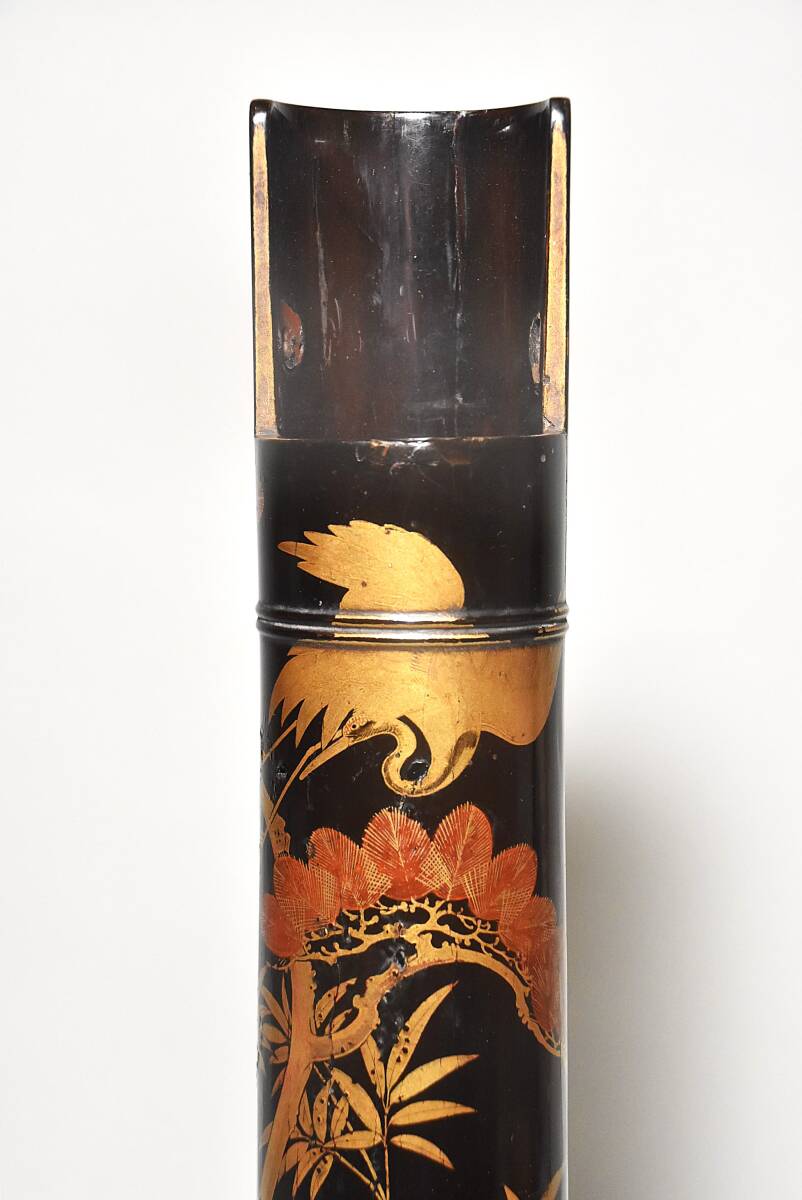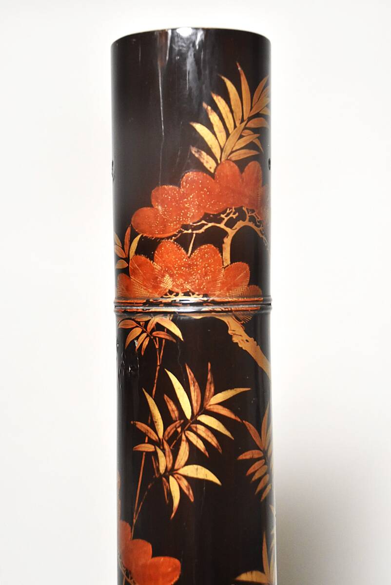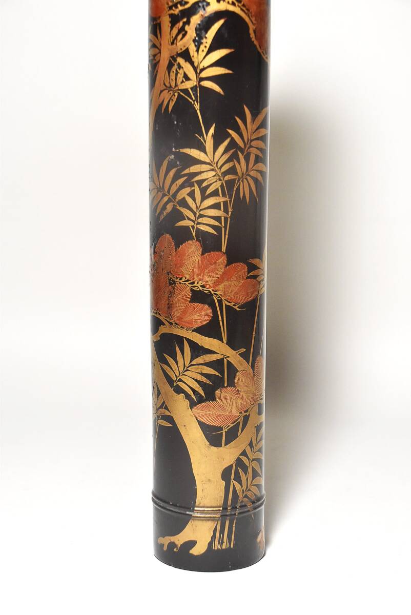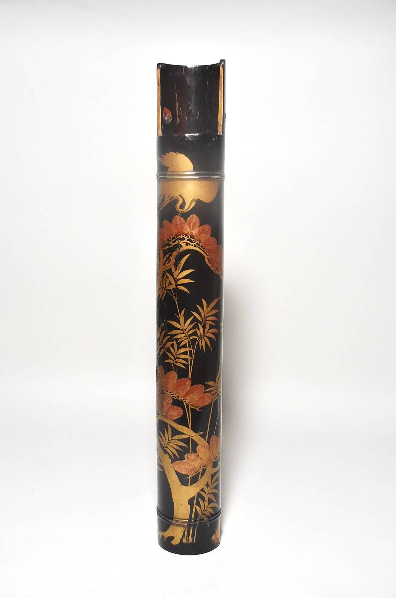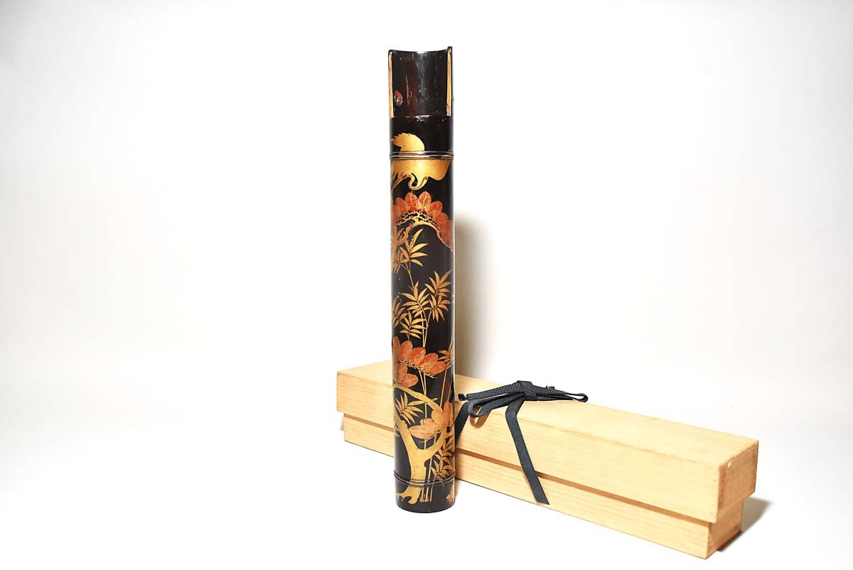 「時代蒔絵筒花器(江戸時代)」です。 江戸中期と思われる丁寧な吉祥文蒔絵の花筒(水筒)で 初見の品で、珍しい物と思います。 漆地は竹の様に見えますが木地でしょう。 中に特注の錫製と思われる落とし筒が収まり 今も花器としてご活用いただけます。 時代なりのヤツレは見られますが 実用、保存、鑑賞に耐える状態です。 どうか、よろしくお願いいたします。