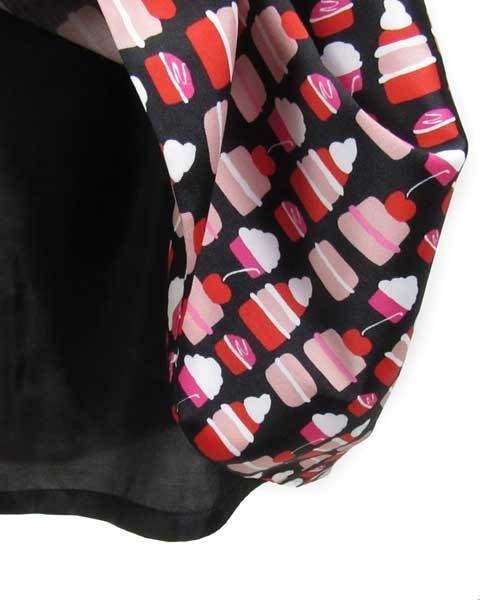 | 黒地に鮮やかなお色使いのケーキ柄のスカート。ややしっかり目の生地で少し光沢があり、華やかさがあります。シンプルなトップスにコーディネートして、スカートをポイントとしたオシャレをお楽しみ頂けます。 |