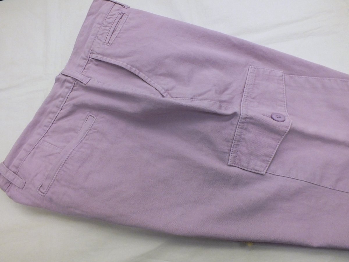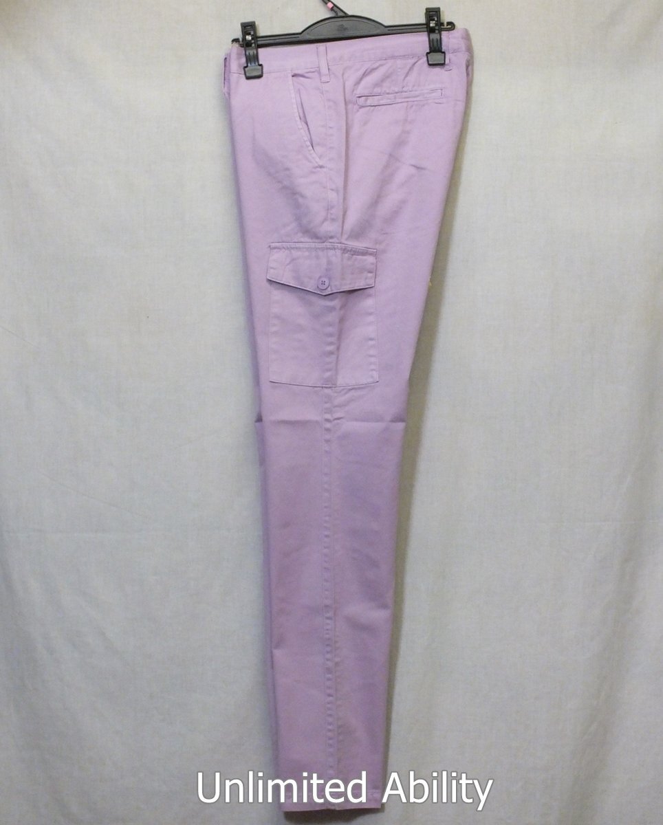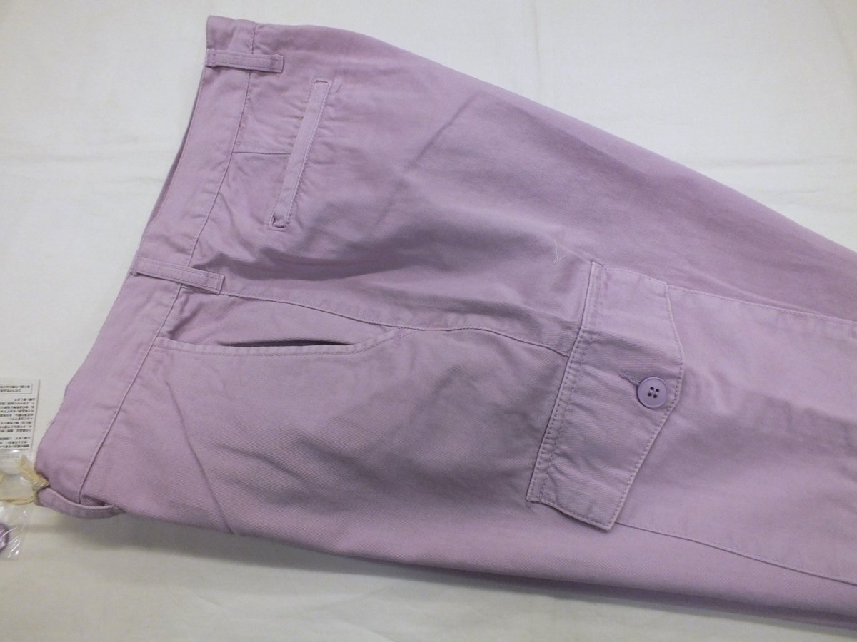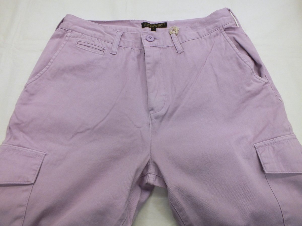 適度にハリがありながらもソフトなコットンツイル生地を使っており、違和感の無い快適な穿き心地に仕上がっています。 ブランド:UNLIMITED ABILITY 商品名:カーゴチノパンツ 素材:綿 100% カラー:ライトパープル サイズ:L寸 希望小売価格:4,900円+税 縫製:Made in China 詳細寸法 M寸 ウエスト79cm/総丈104cm/股下78cm/股上26cm/渡り幅29cm/ヒザ幅19.5cm/裾幅18cm L寸 ウエスト82.5cm/総丈107cm/股下80cm/股上27cm/渡り幅30cm/ヒザ幅20.5cm/裾幅19cm XL寸 ウエスト86cm/総丈110cm/股下82cm/股上28cm/渡り幅31cm/ヒザ幅21.5cm/裾幅20cm | ||||