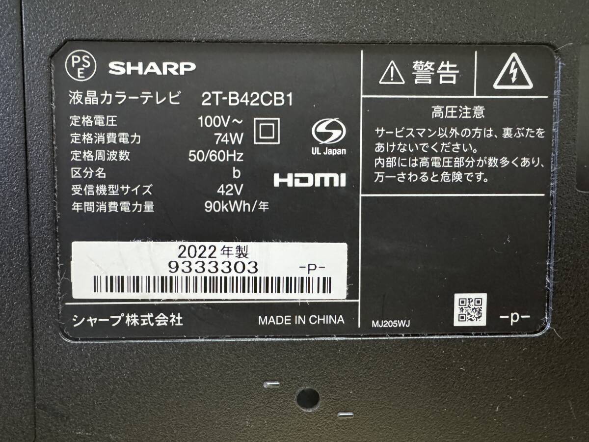 2022年製 綺麗 シャープ AQUOS 42型 LED 液晶テレビ 2T-B42CB1 AQUOS City接続可 ネット動画 u-next DMM 視聴可能 管理F1940