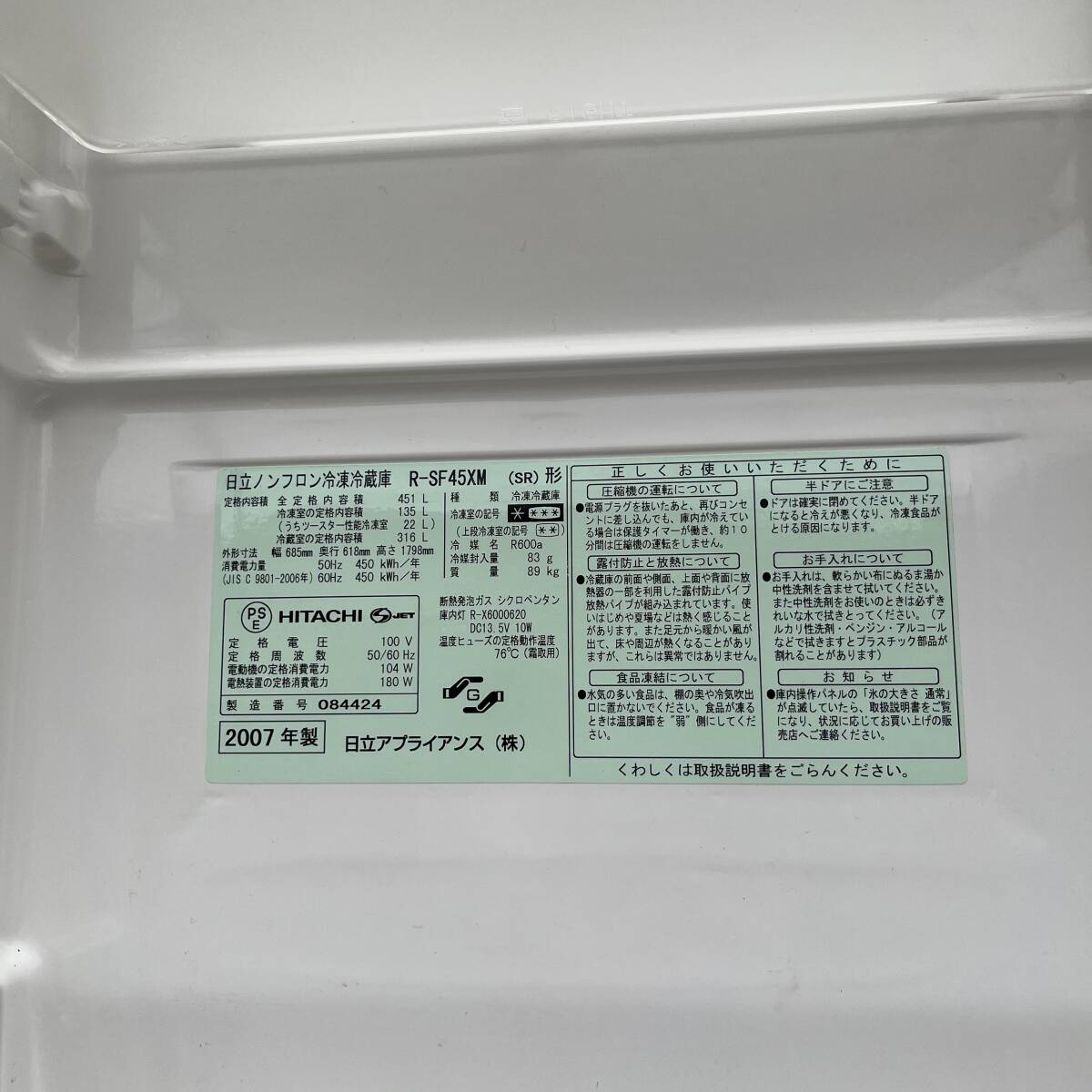 【直接引取歓迎】HITACHI 日立 R-SF45XM 451L 冷蔵庫 2007年製 動作品 ステンレス系 大容量 家庭用 6ドア 中古 現状品