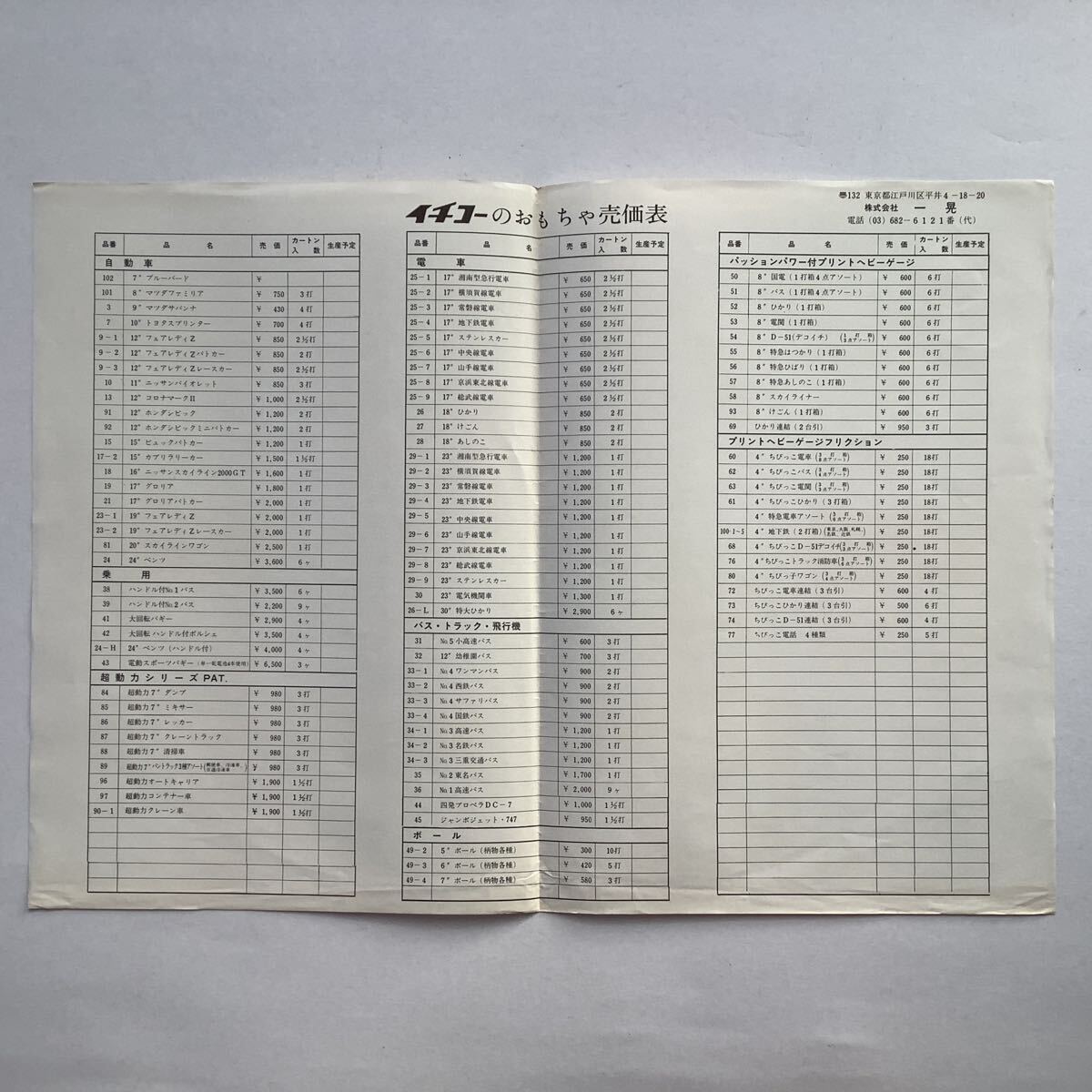 非売品 イチコーのブリキ玩具カタログ1978年とおもちゃ売価表です(サイズ約29-11.3㎝)この時代はまだ国産ブリキ自動車が数百円で買える時代でした 写真でご理解ご判断出来る方のみ御検討宜しくお願い致します。