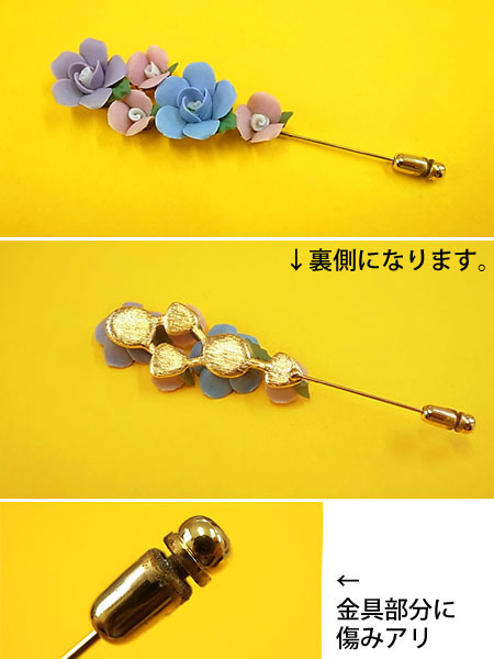 ◎ブローチ・・・金具部分はゴールドになります。その上に、ブルーやピンクのお花飾りが施されています。