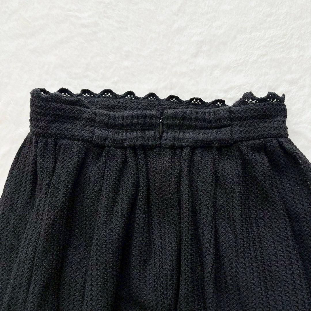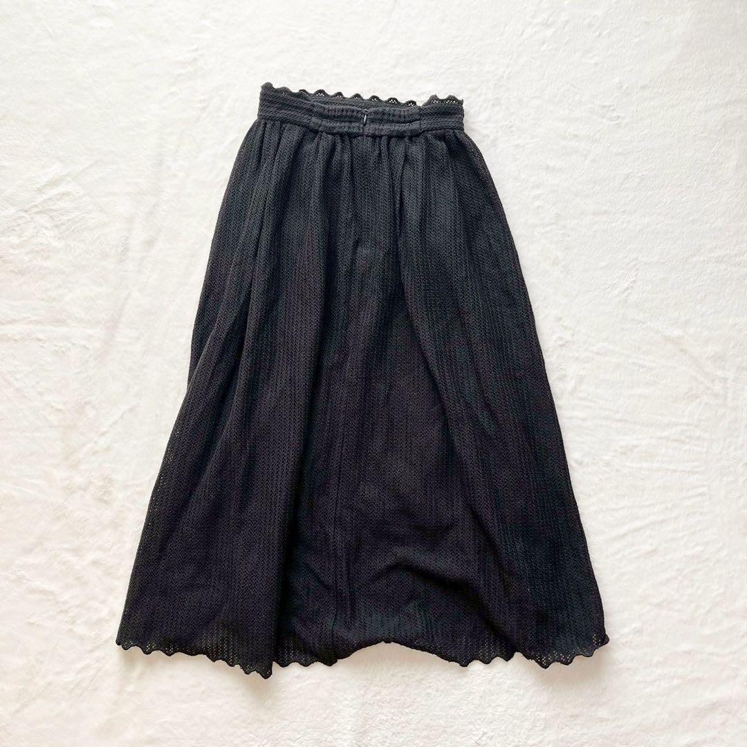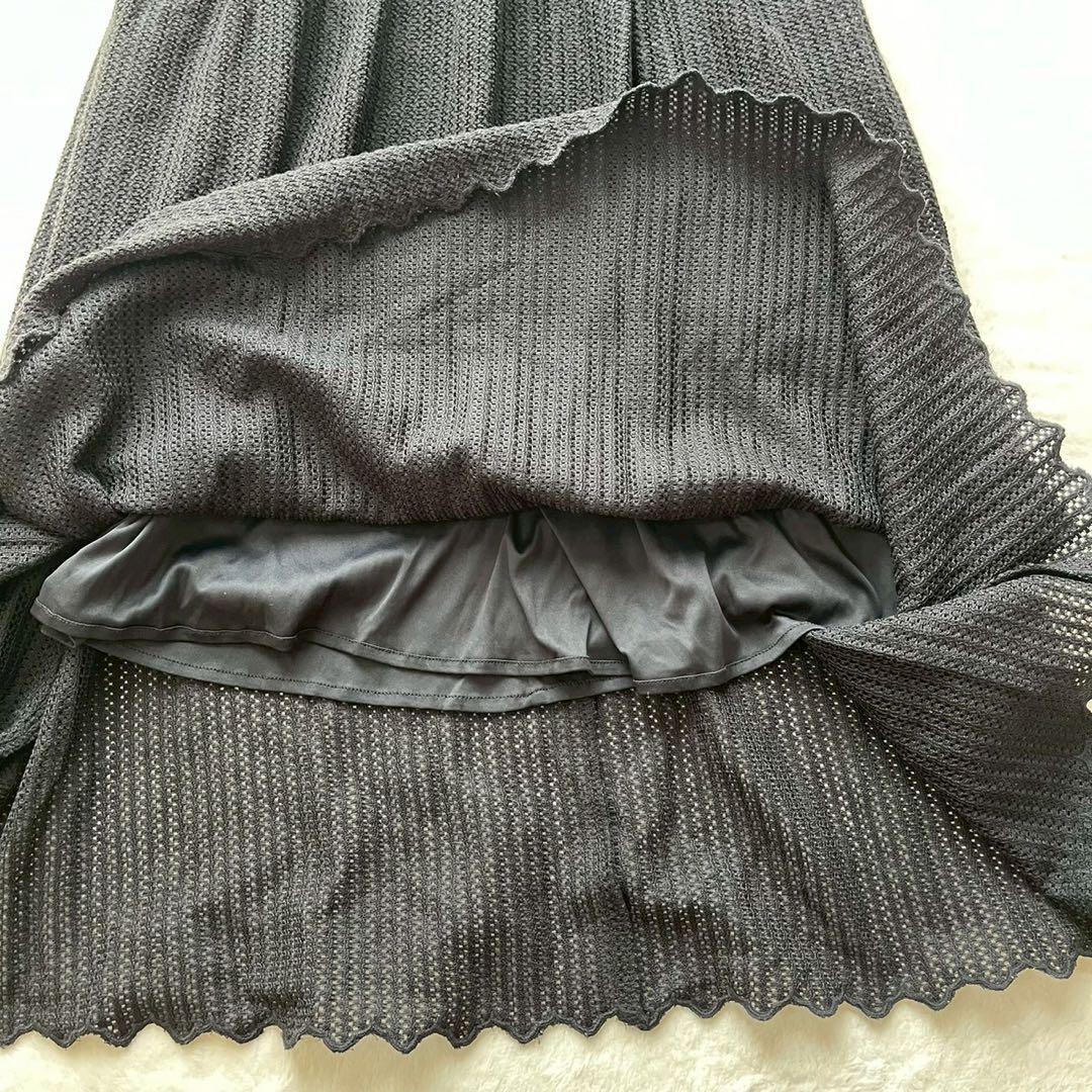 スカラップヘムデザインの黒ロングスカート、編み地で軽やかな印象。