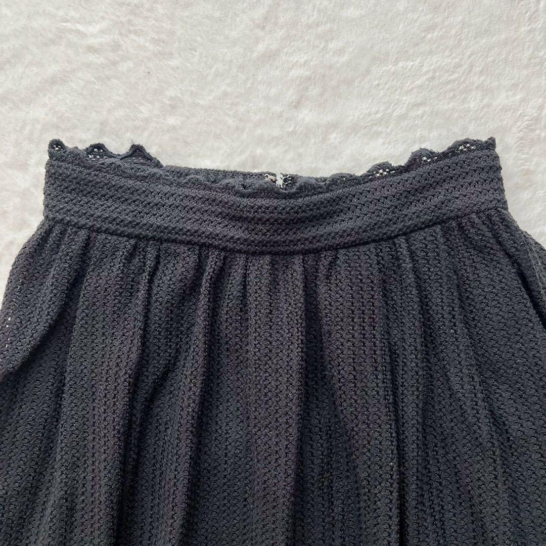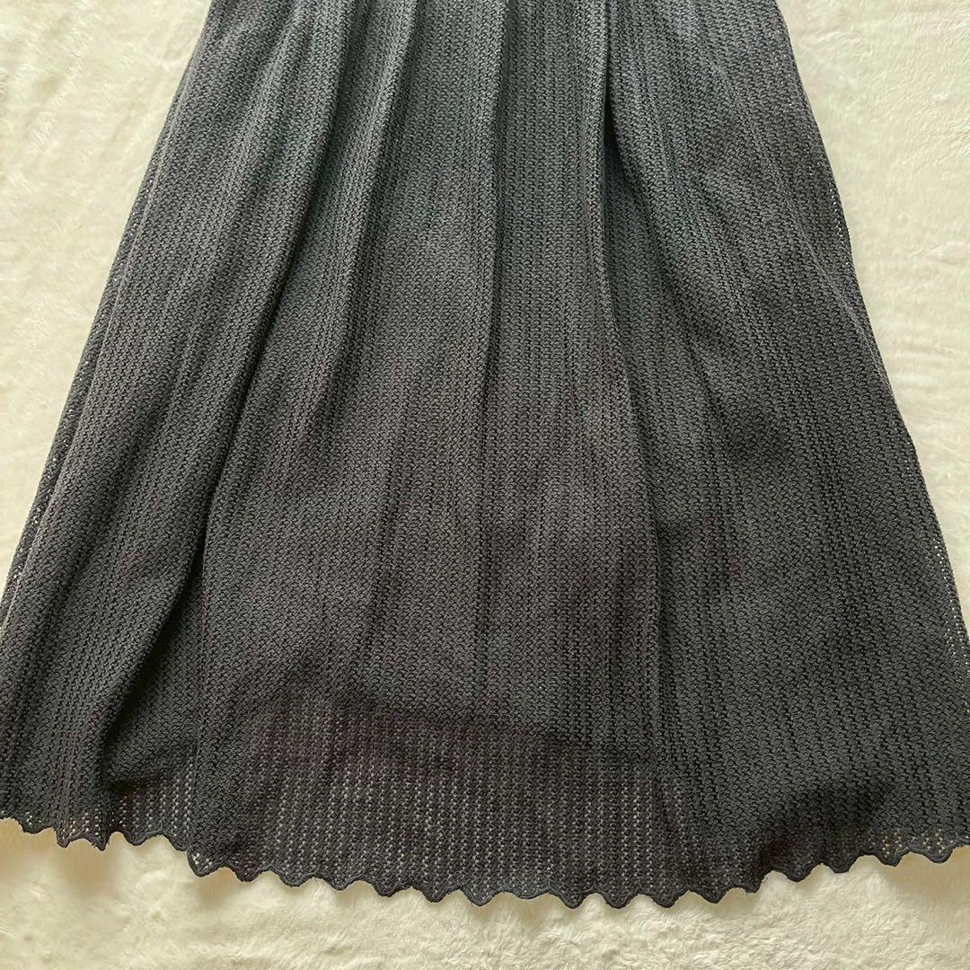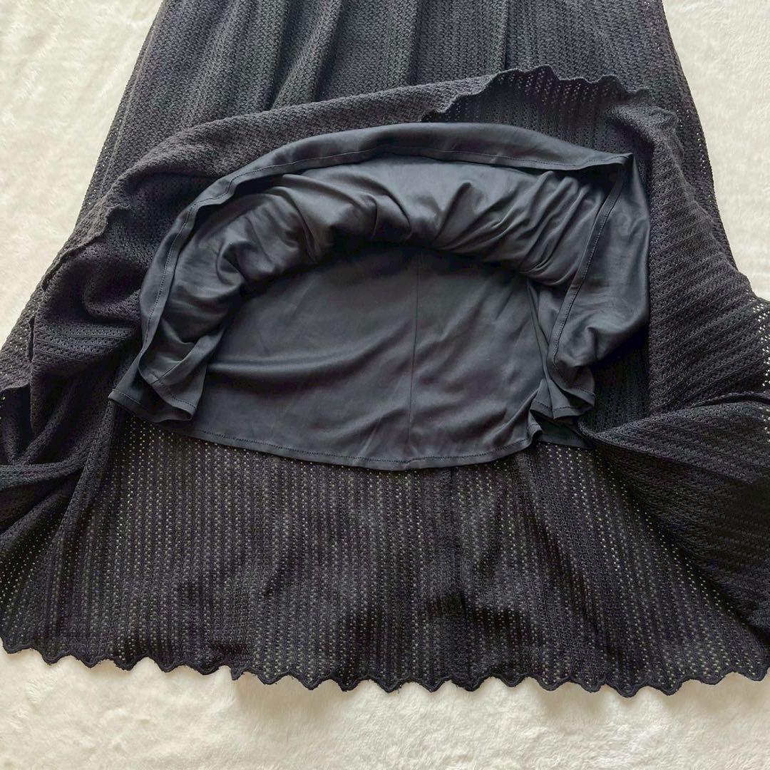 スカラップヘムデザインの黒ロングスカート、編み地で軽やかな印象。